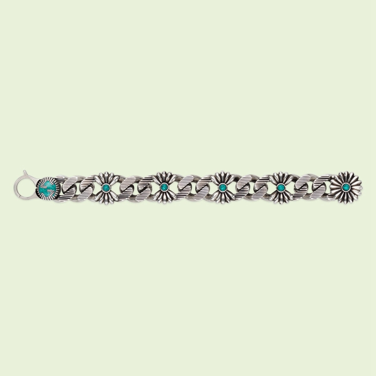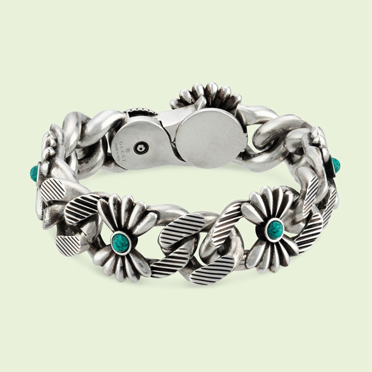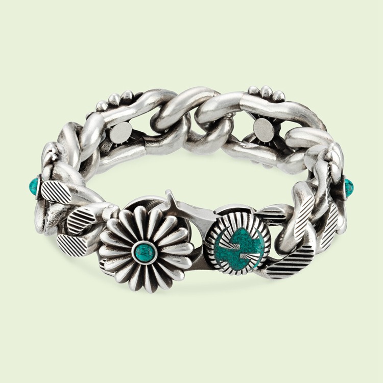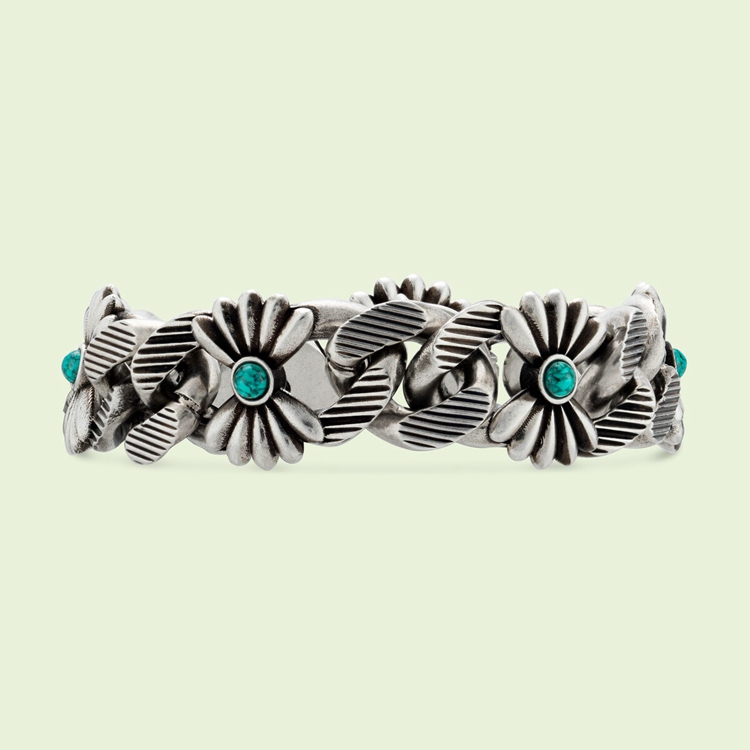 Style 700432 J8H67 8183 This silver bracelet is Crafted from a bold engraved chain, featuring flowers and The Interlocking G logo. A turquoise resin completes The precious House symbols With a touch of color.