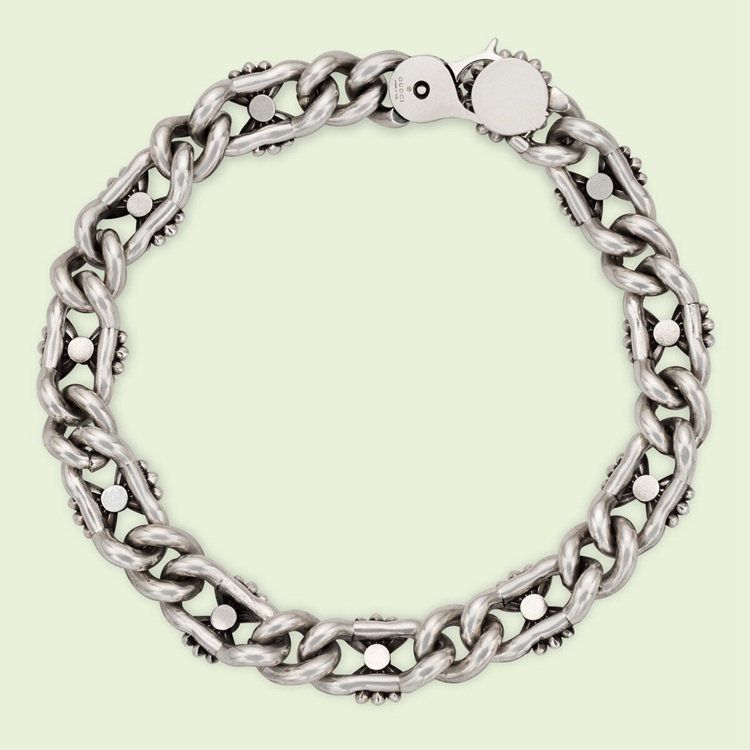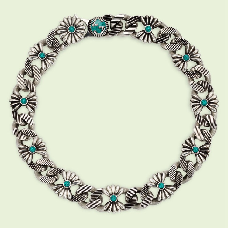 Style 700433 J8H67 8183 This silver necklace is Crafted from a bold engraved chain, featuring flowers and The Interlocking G logo. A turquoise resin completes The precious House symbols With a touch of color. This item is Part of Gucci’s MX, a selection that embraces freedom of expression and explores identity norms.