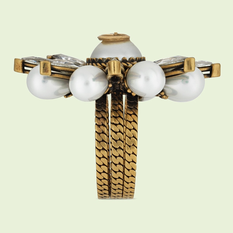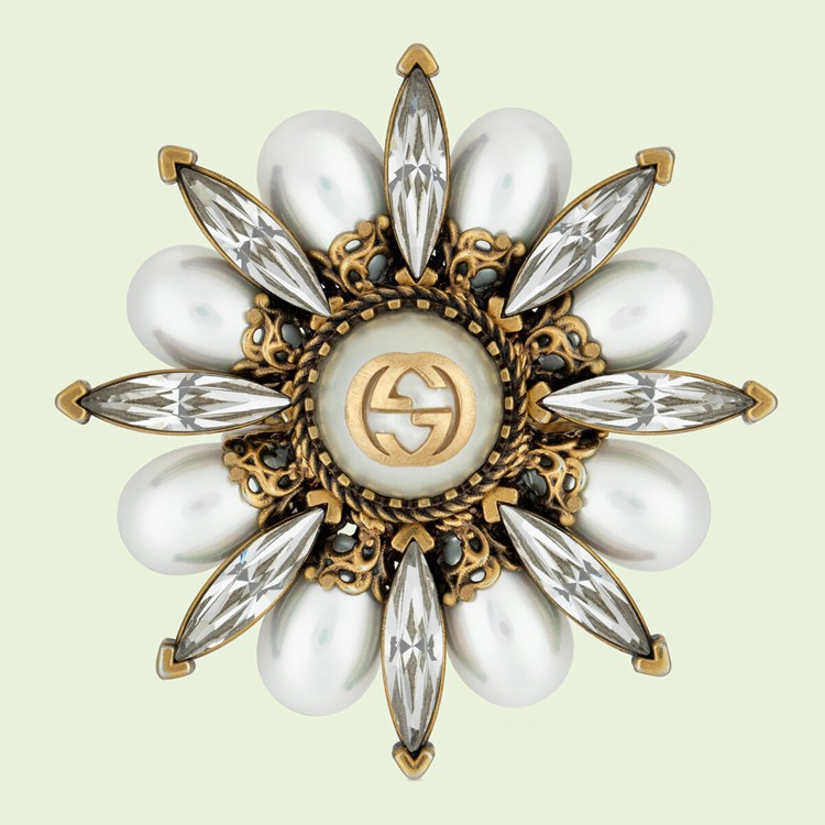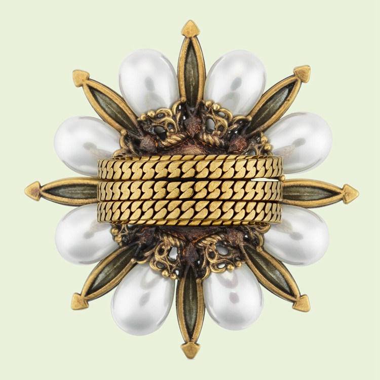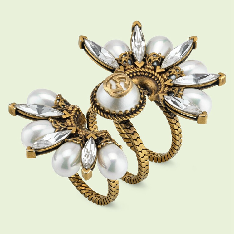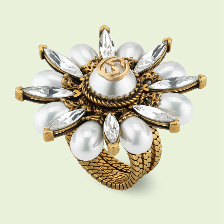Style 702719 I9875 8623 Crafted from dark yellow gold-toned metal, three stackable bands characterize This statement solitaire ring. Once stacked together, The bands form a delightful flower embellished With resin pearls and crystals. The Interlocking G decorates The center, imbuing a subtle logo feel.