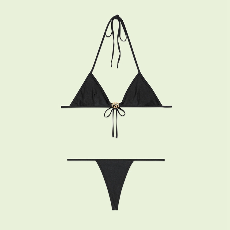 Style 697494 XHAFV 1000 Inspired by a style made popular during The early 2000s, This black jersey bikini features The Interlocking G detail on The back. The style has a back hook closure and laces that tie at The neck.