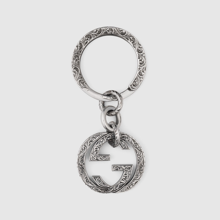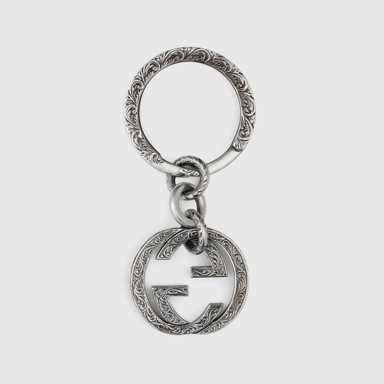 Style 455308 J8400 0811 A silver keychain With interlocking G pendant With engraved pattern.
