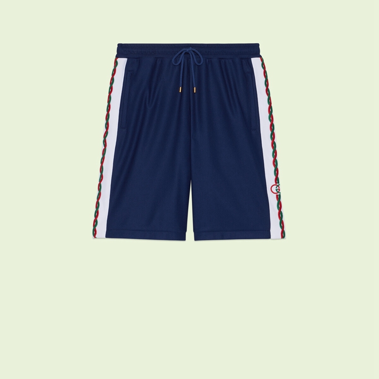 Style 692126 XJD7N 4622Blue polyester piquet shorts With braided detail and Interlocking G embroidery. The Classic red and green Color combination was originally Inspired by The chromatic range of fox-hunting jackets popular in The United Kingdom. To This day The same Color combination continues to act as a code of membership and identification and has evolved year after year. For Gucci Love Parade, The stripe is presented as a braided detail and is paired With The Interlocking G detail.