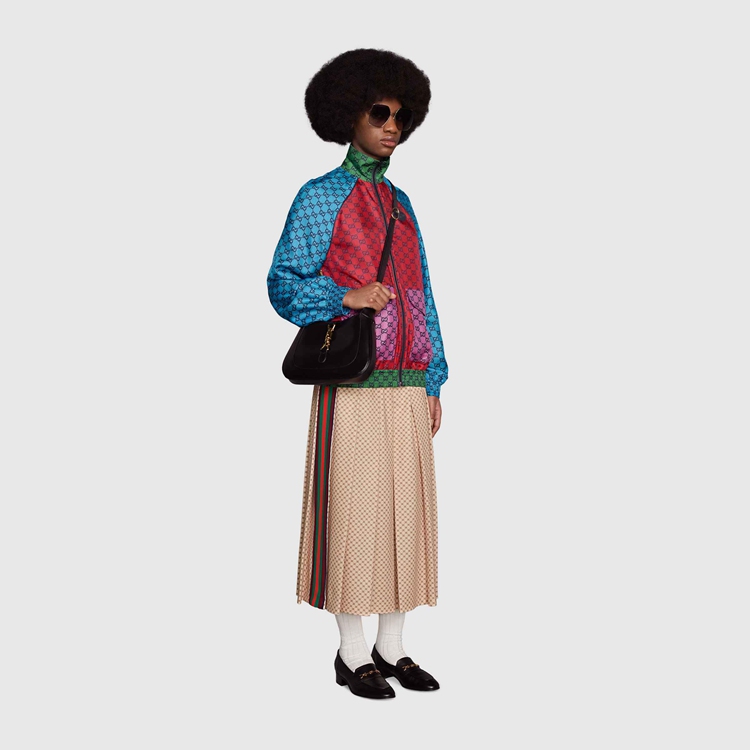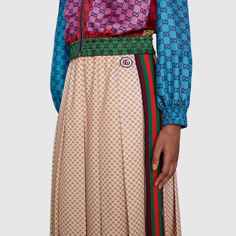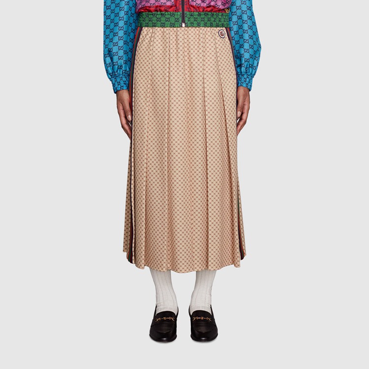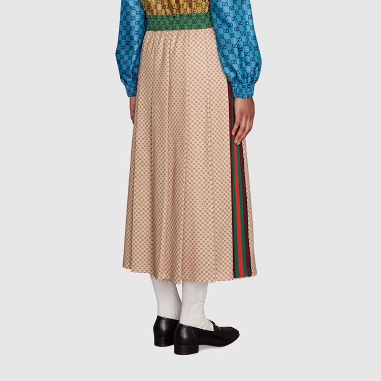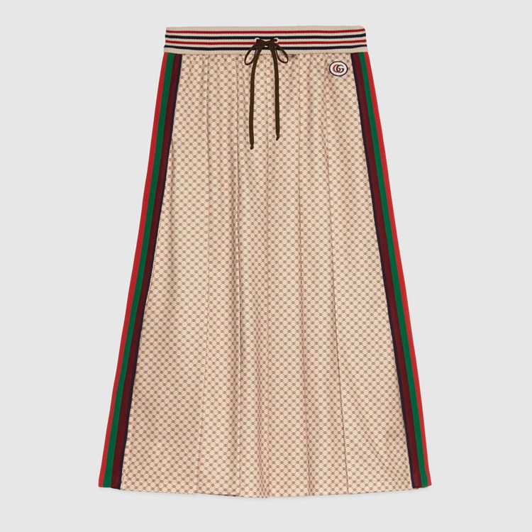 Style 661786 XJDFP 9115 A New play on The Classic Interlocking G logo animates This technical jersey skirt. Embracing The concept of experimentation, The tracksuit style brings With it an expansion of -possibilities throughout The Ouverture collection. Here, Emblematic House’s symbols like The Web stripe and The vintage Gucci logo complete The style.