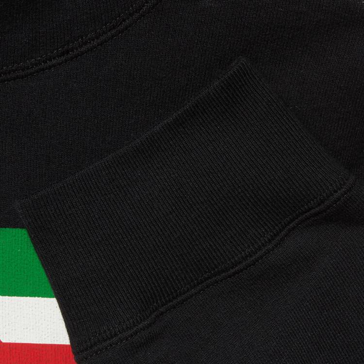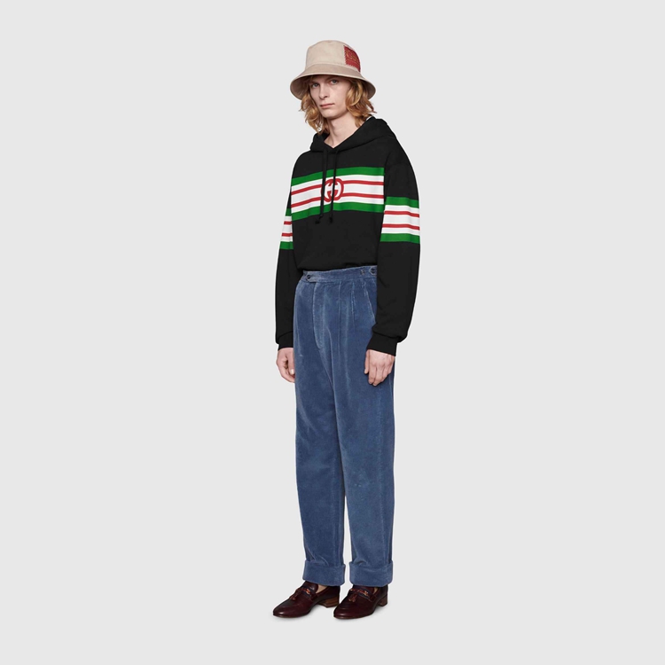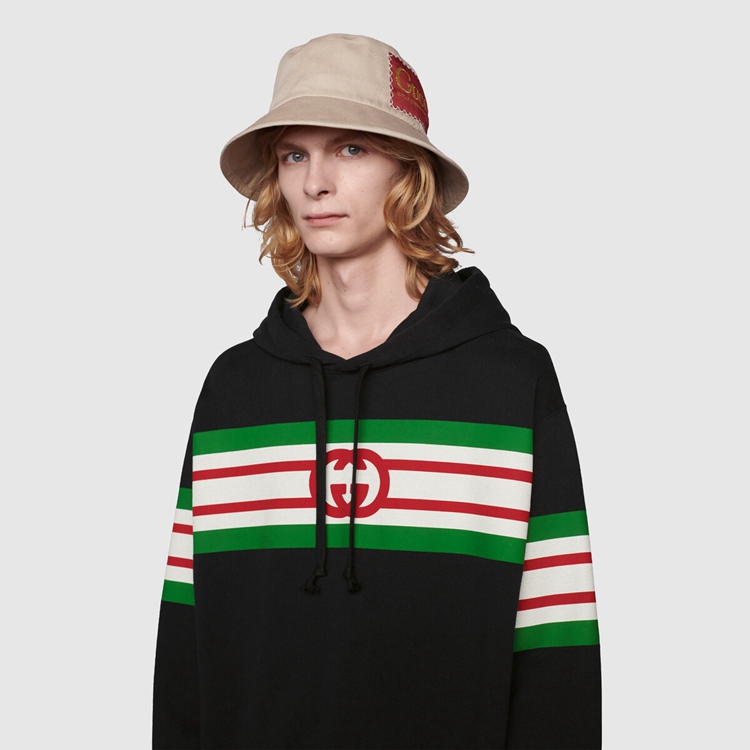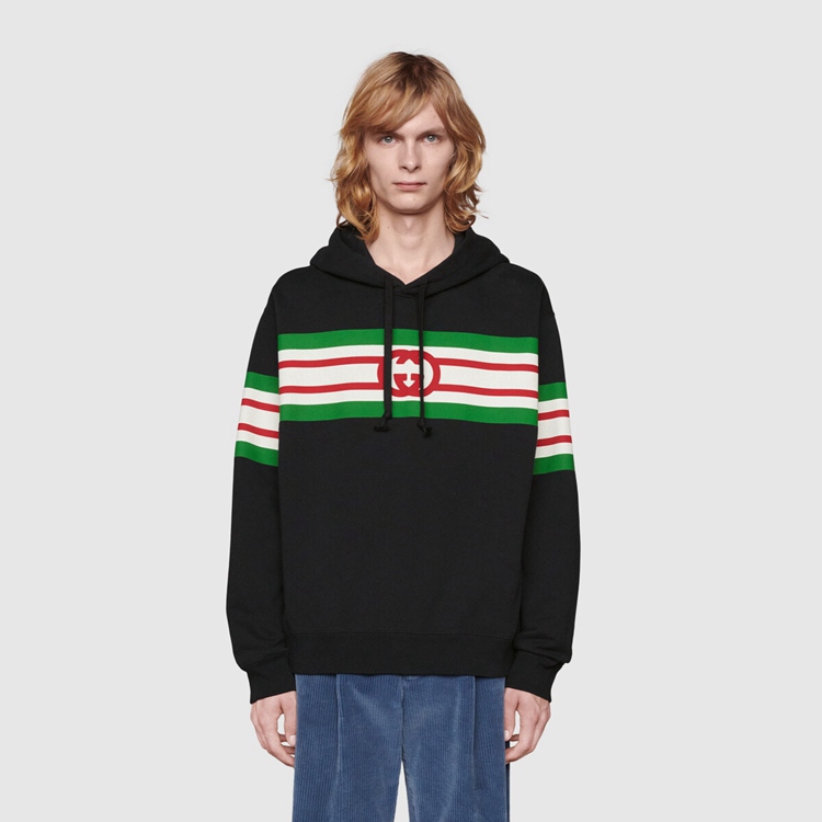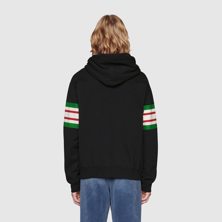 Style 646953 XJDAH 1082 A playful take on House codes, green, red and white stripes reminiscent of The Classic Web combine With The Interlocking G logo atop This black felted cotton jersey hooded sweatshirt, specifically washed For a vintage effect.