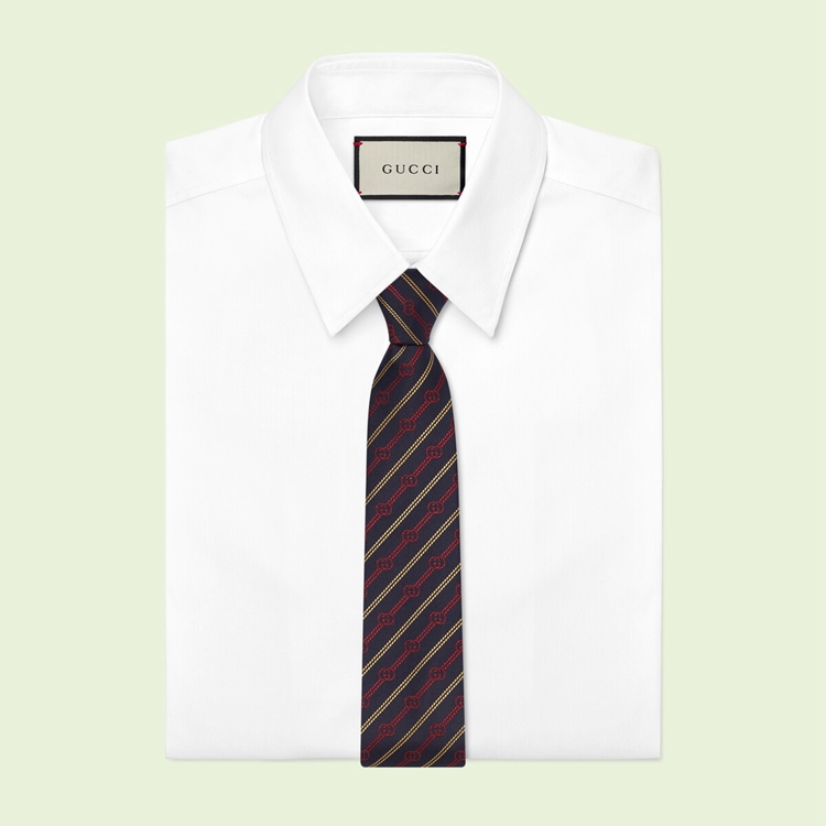 Style 695332 4E002 4074 Emblematic motifs and symbols synonymous With The House combine to enrich silk accessories, continuing The Gucci narrative seen in The ready-to-wear collection. Here, The signature Interlocking G appears atop This dark blue silk tie as an intricate red jacquard detail.