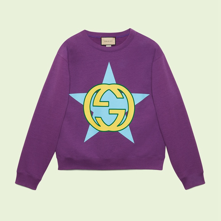 Style 626990 XJD7V 5137 Imbued With vibrant colors, mystical nuances and a dream-like atmospheres, The star motif has long been synonymous With The House, adding a playful touch to Classic styles. For Gucci Love Parade, The cherished pattern returns as a Part of The ‘Hollywood stars’ narrative. Here, The Interlocking G is placed inside of a star on This purple cotton jersey sweatshirt.