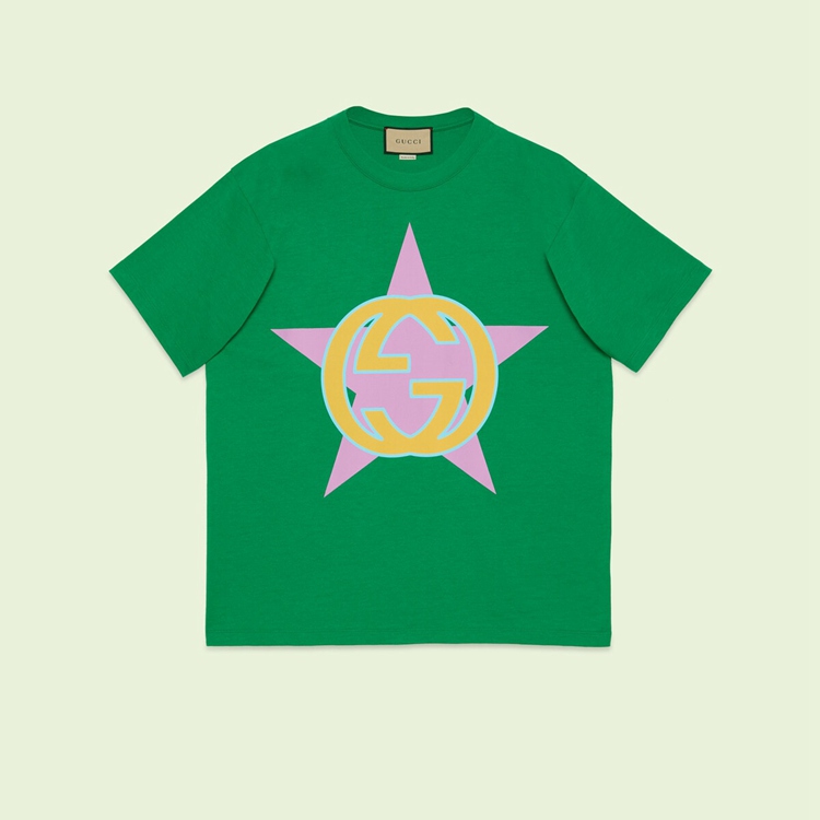 Style 616036 XJD7U 3129 Imbued With vibrant colors, mystical nuances and a dream-like atmospheres, The star motif has long been synonymous With The House, adding a playful touch to Classic styles. For Gucci Love Parade, The cherished pattern returns as a Part of The ‘Hollywood stars’ narrative. Here, The Interlocking G is placed inside of a star on This green cotton jersey T-shirt.
