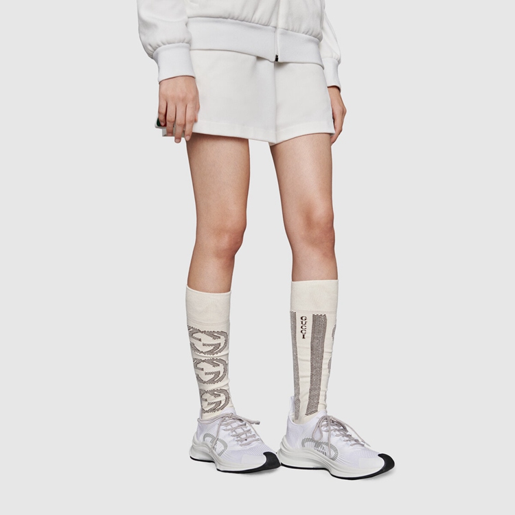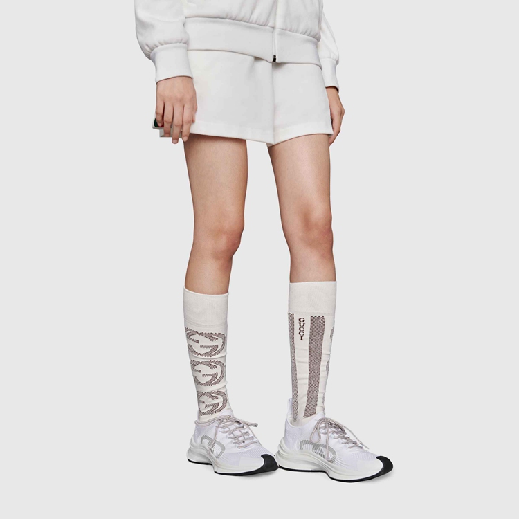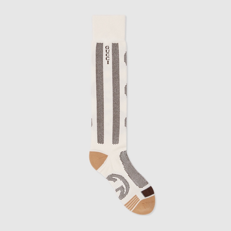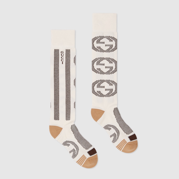 Style 675854 3GA10 9079 These long white cotton blend socks, With a contrasting beige toe and heel, are reminiscent of those worn in horse riding—a homage to The House’s equestrian roots. The recognizable Interlocking G motif completes The style For a subtle design twist.