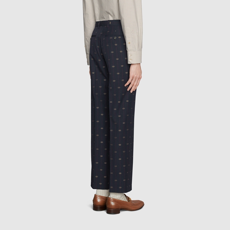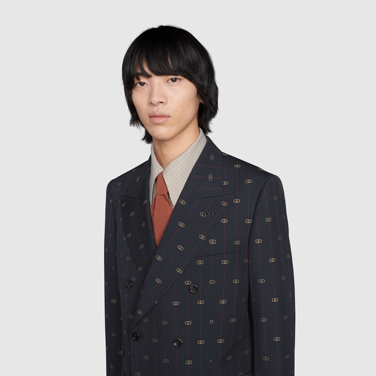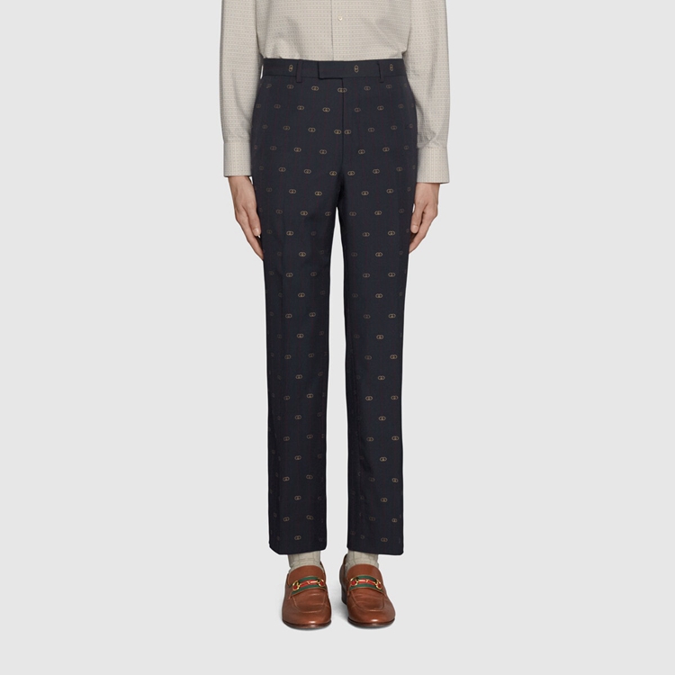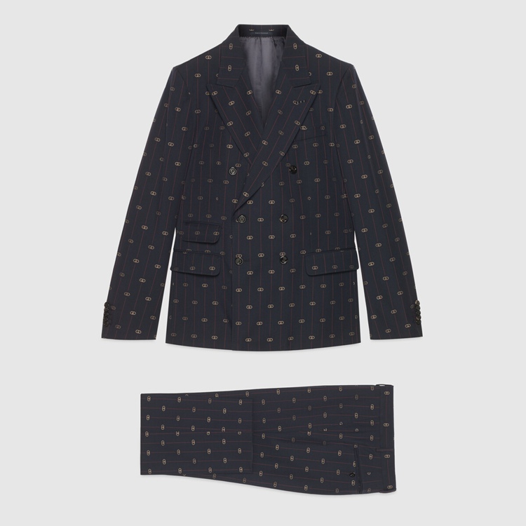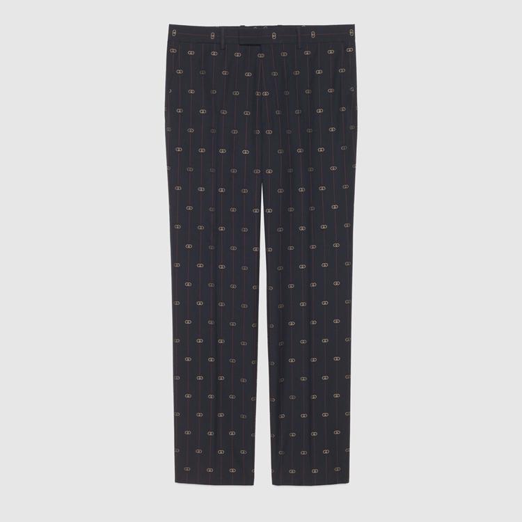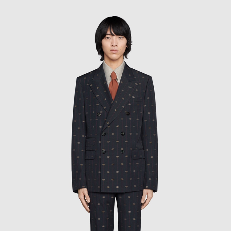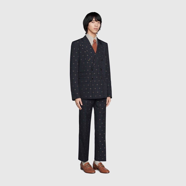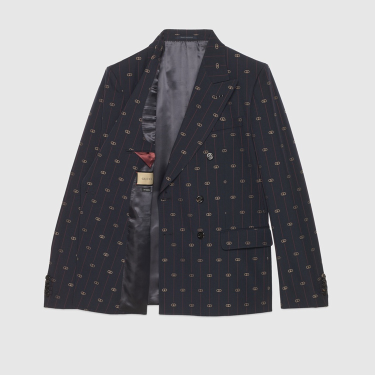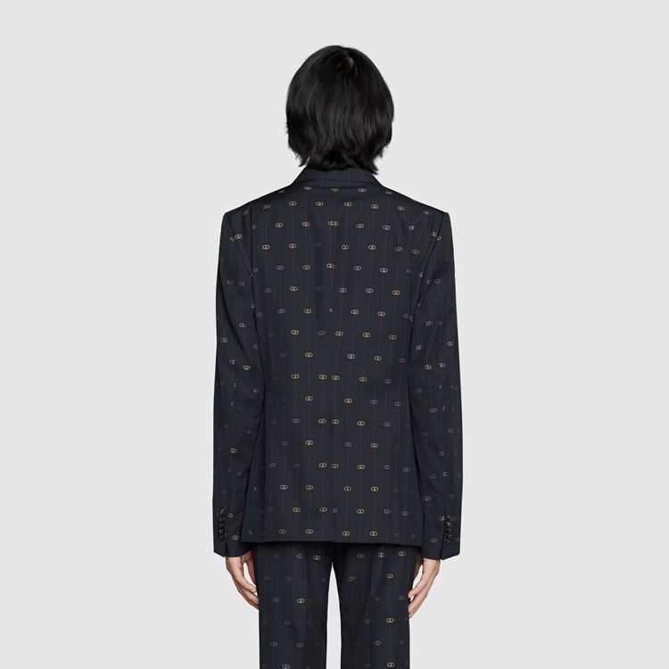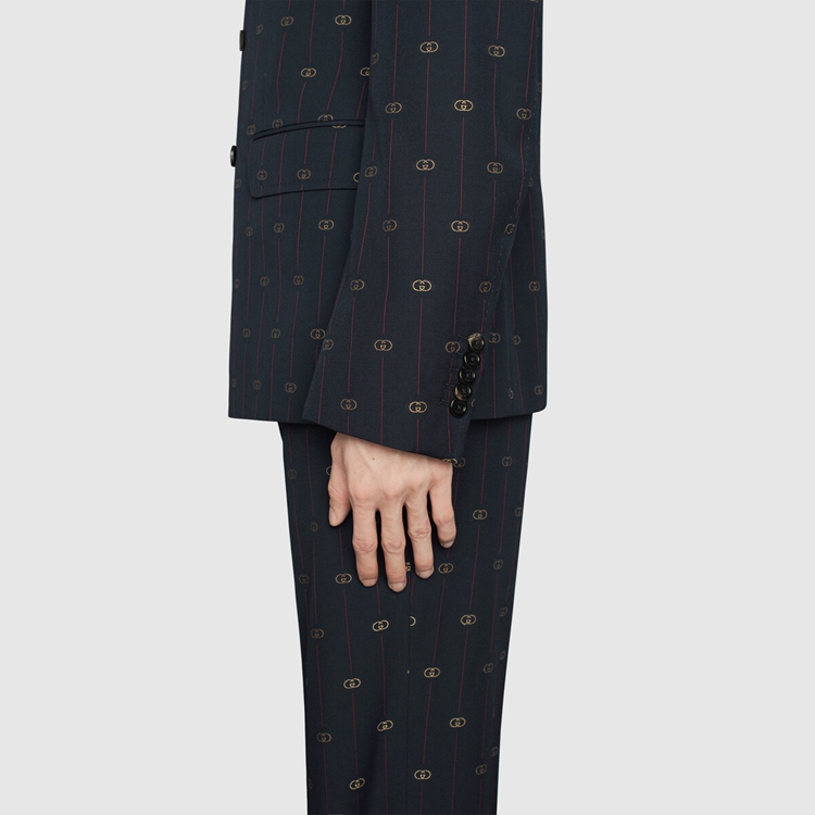 Style 660190 ZAGWR 4956 The historic Gucci suit has transcended into contemporary separates that speak to The current House narrative. Under The direction of The Creative Director, Gucci has pushed The established notions of tailoring and enhanced them With diverse fits, fabrics and codes. Each piece possesses a sense of distinct exclusivity in a range of shapes and styles. An essential fit Interlocking G stripe jacket With a modern cut and structured shoulders With matching straight leg pants.