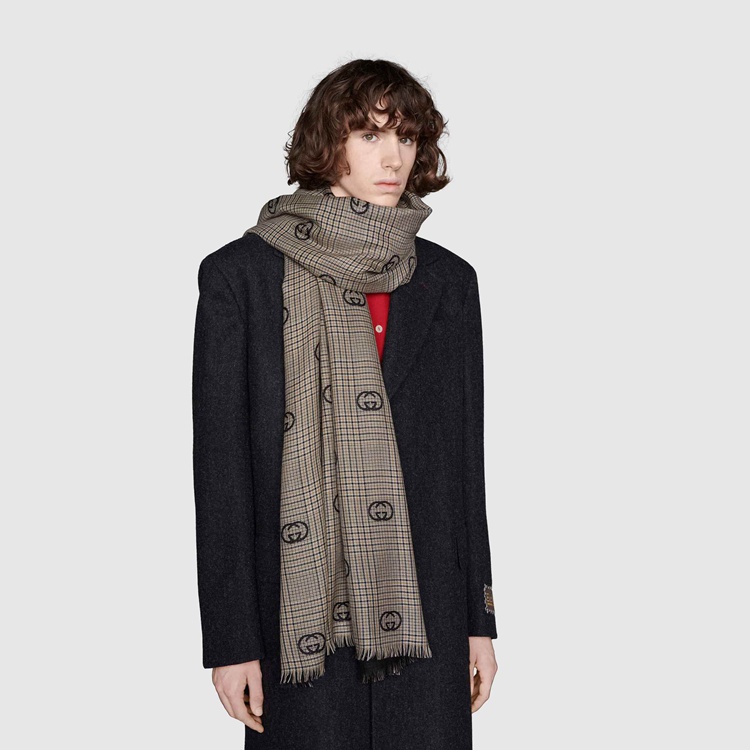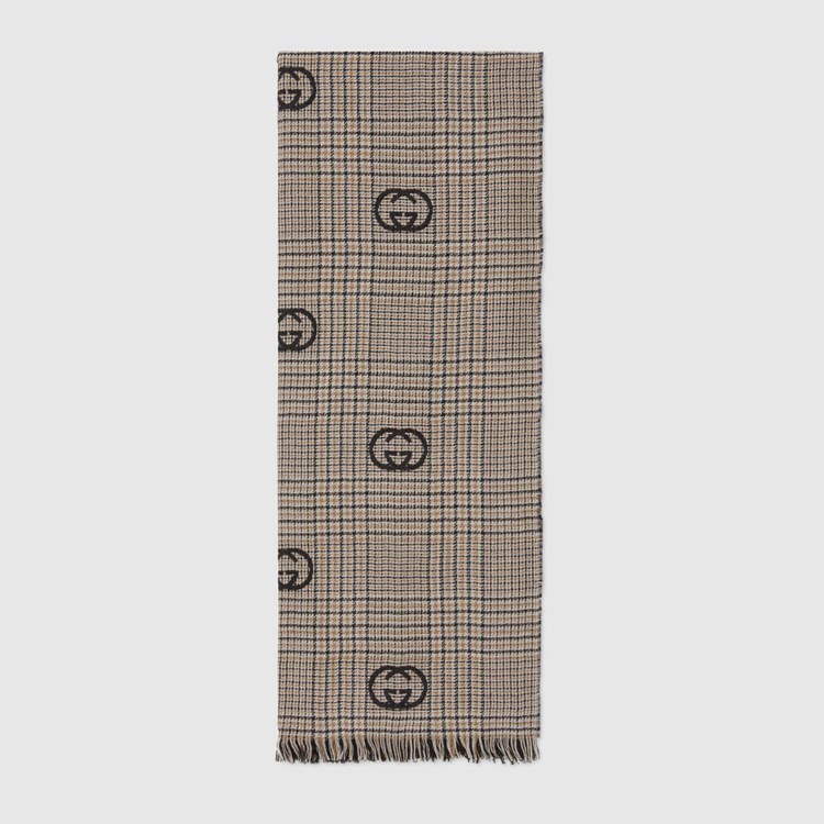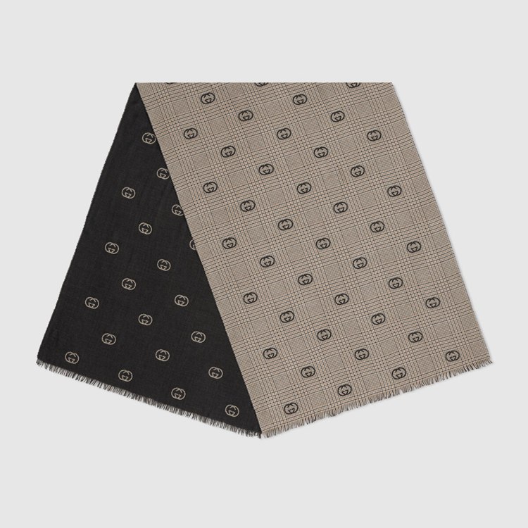 Style 662491 4GABC 9261Gaining notoriety in The 1960s, The Emblematic interlocking G logo is representative of Founder Guccio Gucci’s initials and has since been reintroduced in a variety of forms and interpretations. Here, The symbol decorates an ivory and dark grey wool stole.