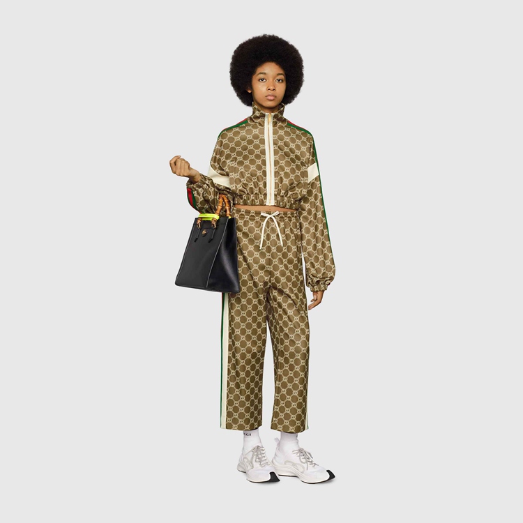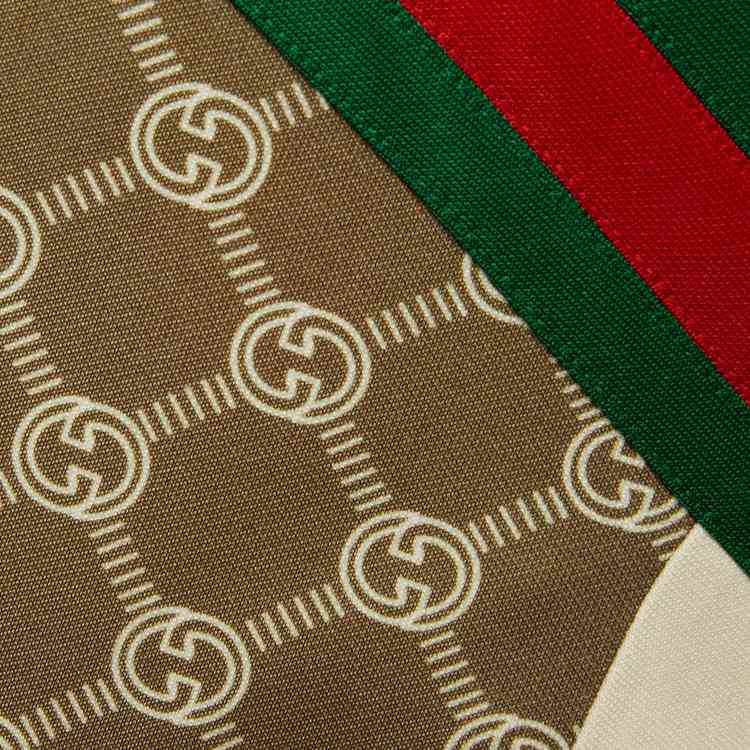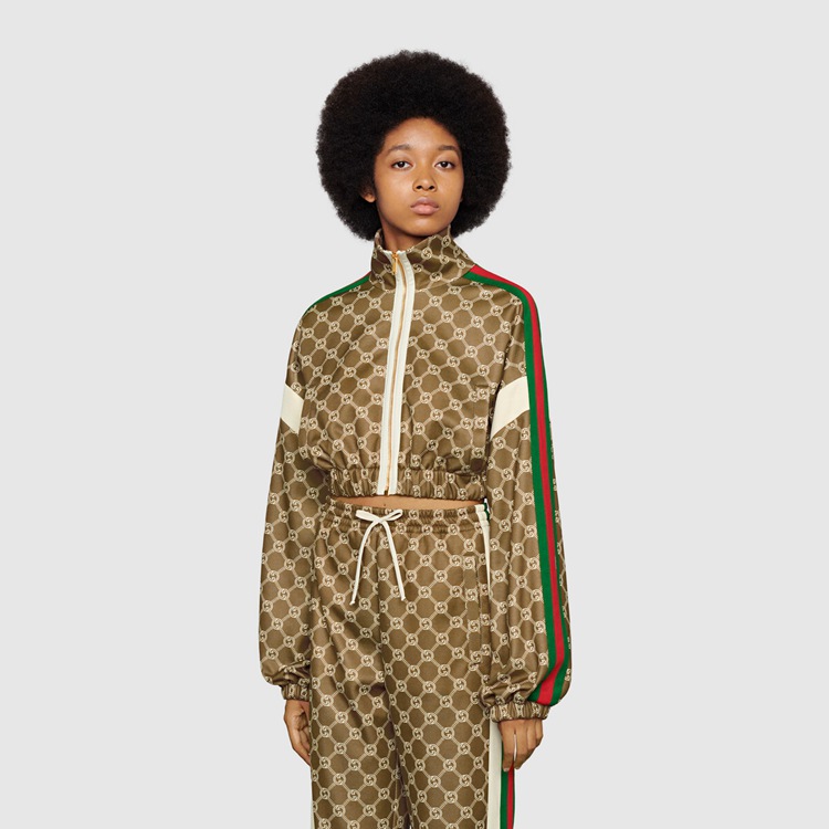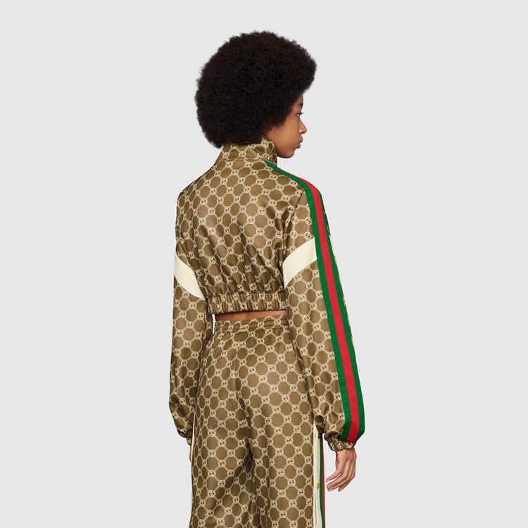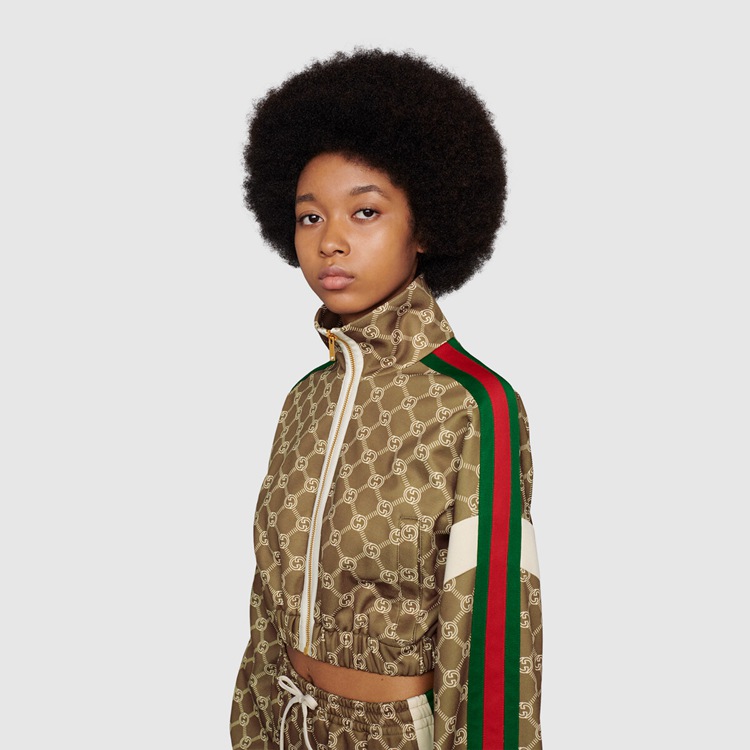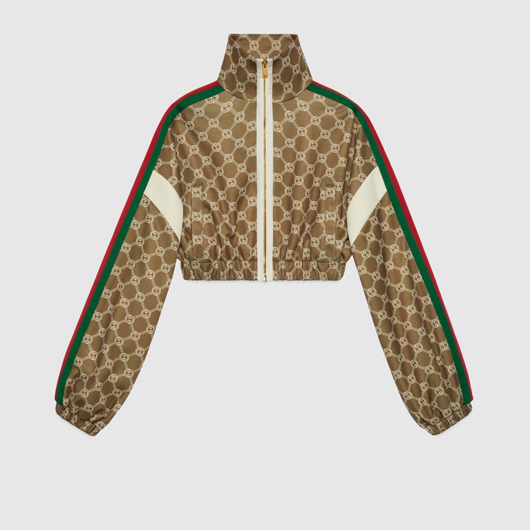 Style 671495 XJD1G 3357 The Interlocking G is reworked into an ollover motif printed on This jacket. Recalling The Web, a green and red stripe further enriches The style. Influences drawn from The sportswear and leisurewear worlds collide into an inherently Gucci style juxtaposing athletic Inspired shapes With Emblematic House’s codes.