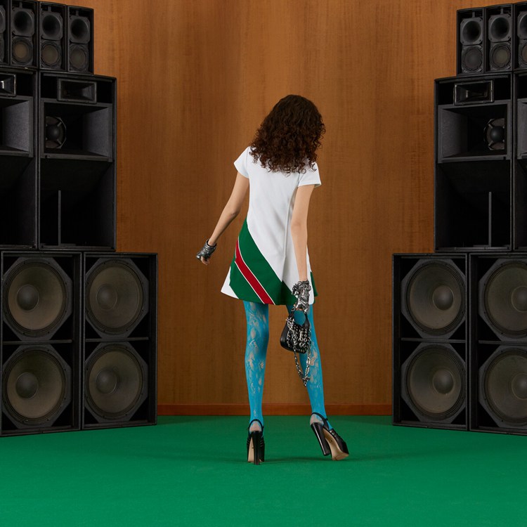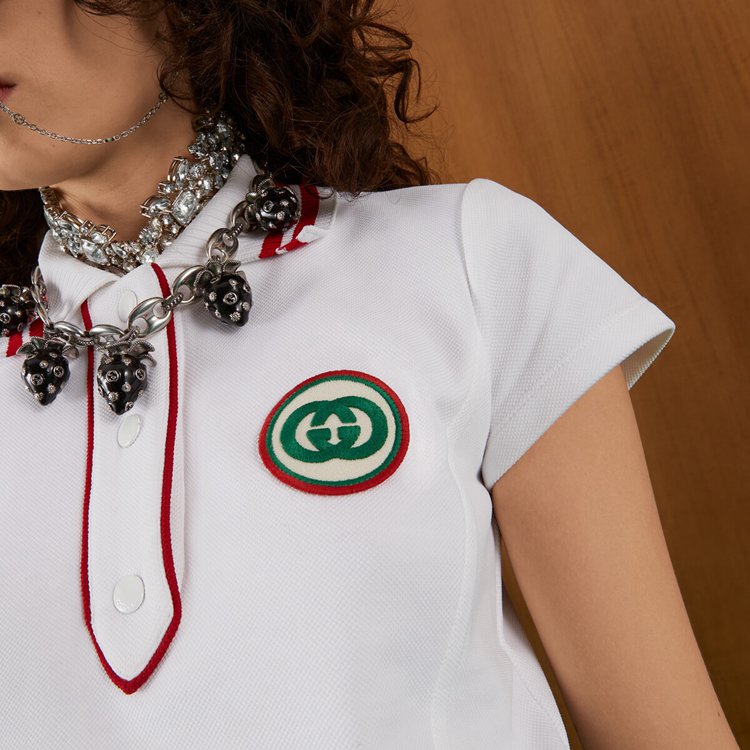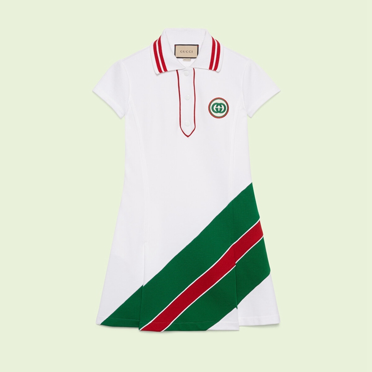 Style 688614 XJD6C 9061 Retro sportswear influences mix With Classic Gucci symbols, resulting in a series of eclectic activewear. This jersey dress is enriched With an Interlocking G patch and The green and red Web detail.