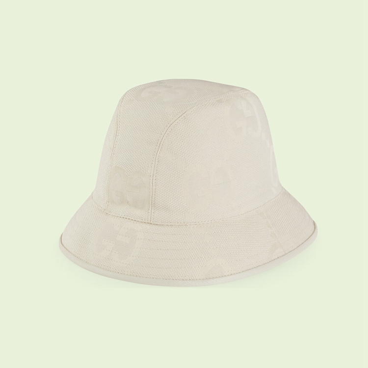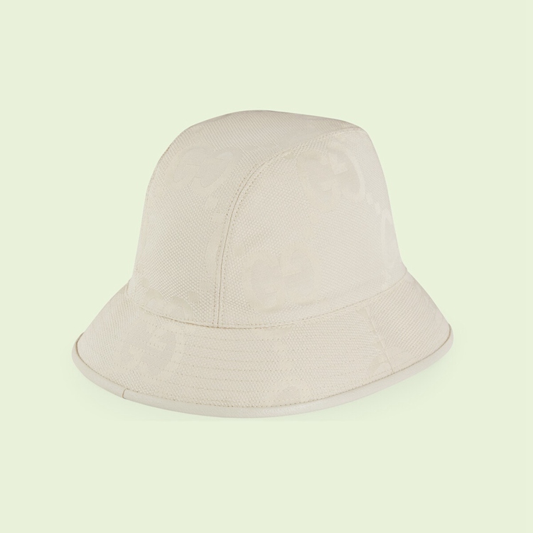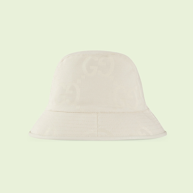 Style 681256 4HANW 9077First introduced as Part of Gucci Aria, The jumbo GG returns For The Gucci Love Parade collection. This version of The Gucci logo is representative of The constant evolution of The House’s heritage. Here This bucket hat is presented in a white variation of The canvas, a New take on The Classic beige and ebony material With a maxi-sized motif.
