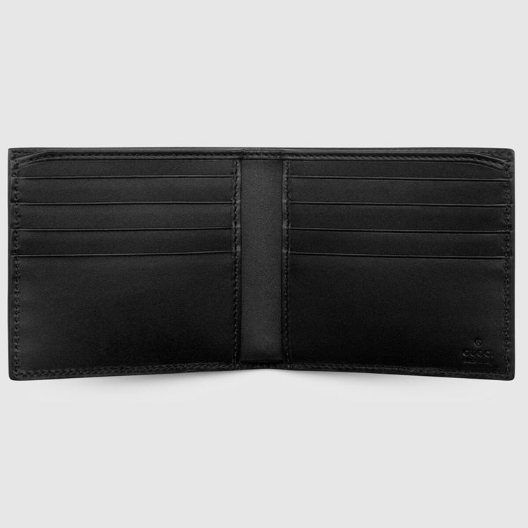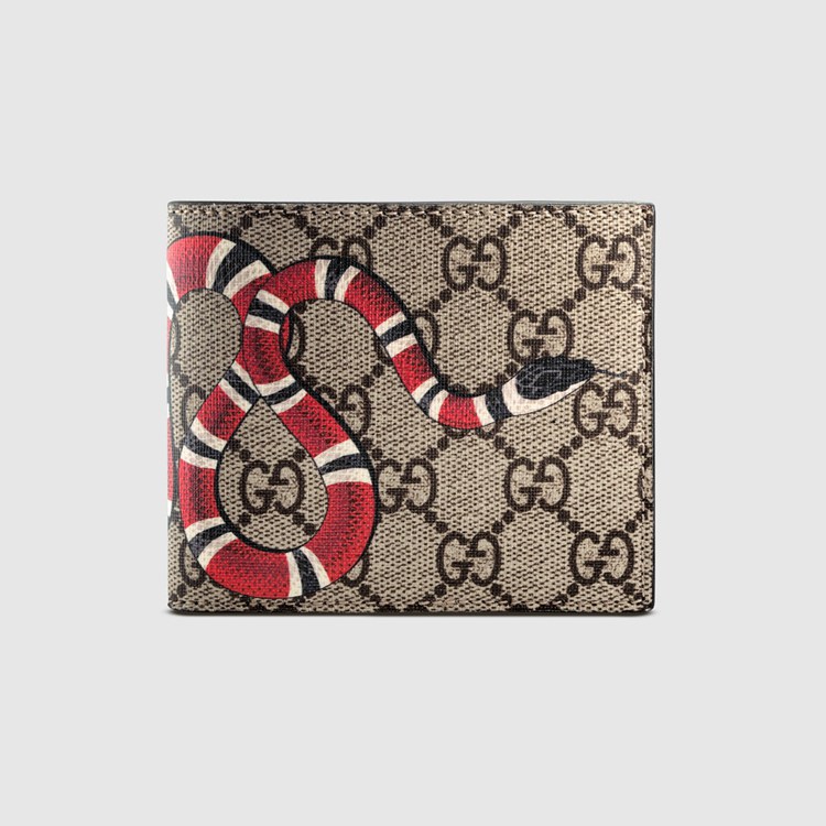 Style 451268 K551N 8666 The Kingsnake, thought to symbolize wisdom and power, emerges as One of The signature details of Alessandro Michele’s collections. Here, it is printed across a bi-fold wallet made in GG Supreme canvas, a material With low environmental impact.