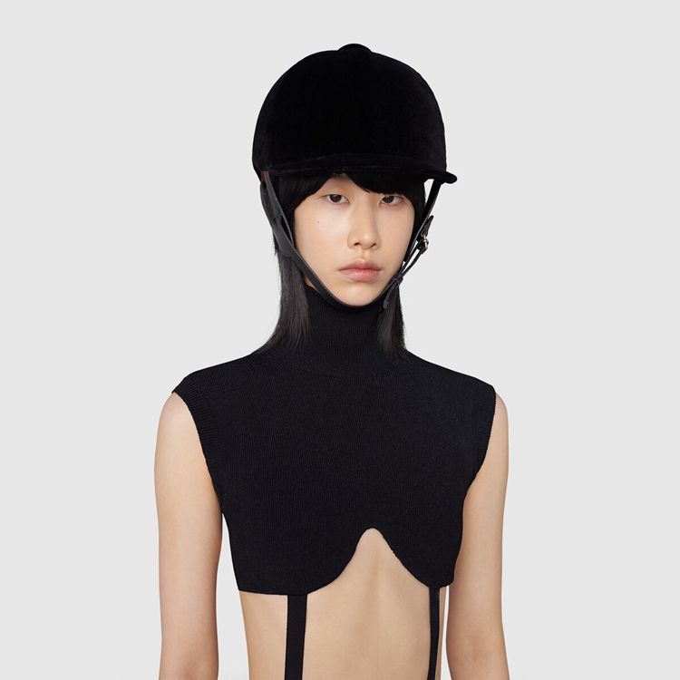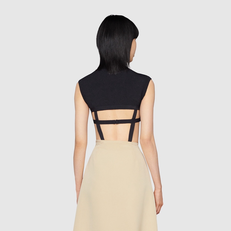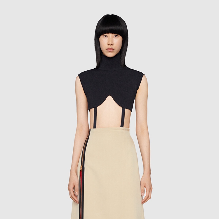 Style 678387 XKB7P 1000 Crafted from black elastic viscose, This knitted bodysuit features a high neck and harness- Inspired details. Alessandro Michele’s vision For Aria brings The spotlight to The House’s heritage. With a connection to The equestrian past, horse riding elements are seen throughout The collection, often expressed through subtle details.