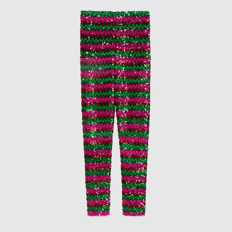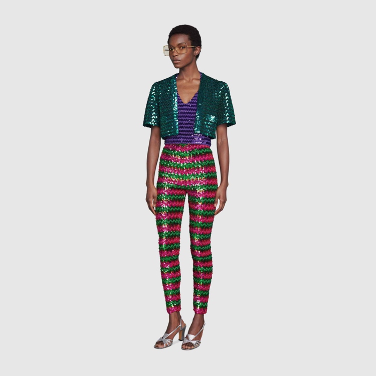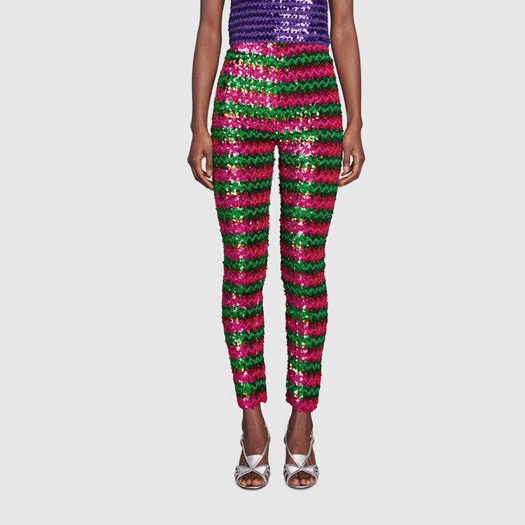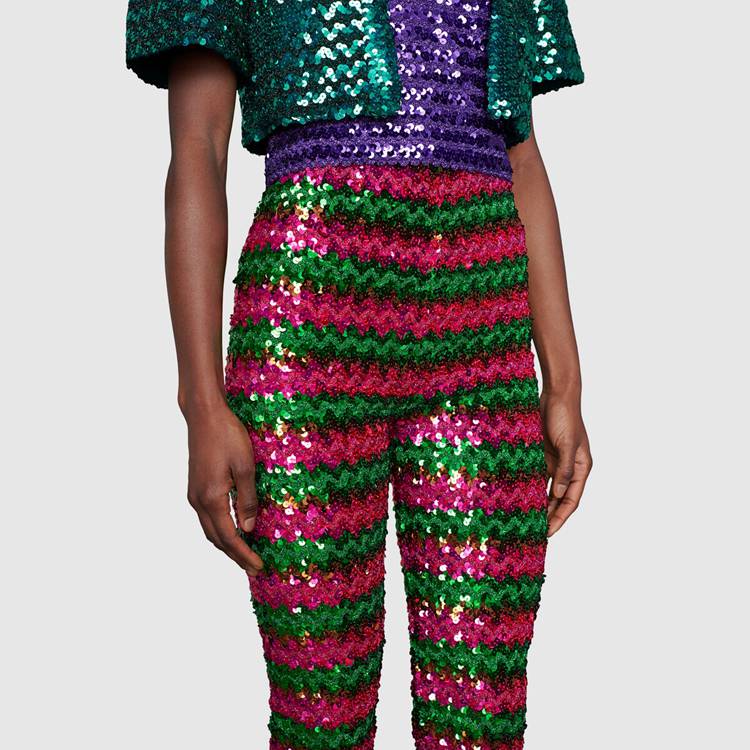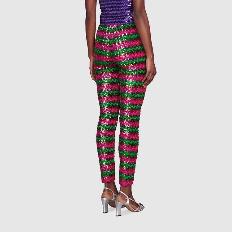 Style 655395 XKBV8 3168 The ‘80s dancefloor filled With synthesizer sounds and flashing lights inspire The choice of sequins and sparkling fabrics. This nostalgic take on The past sees elements from The era brought into The present, like in This pant Crafted from green and pink lamé and sequin embroidery.
