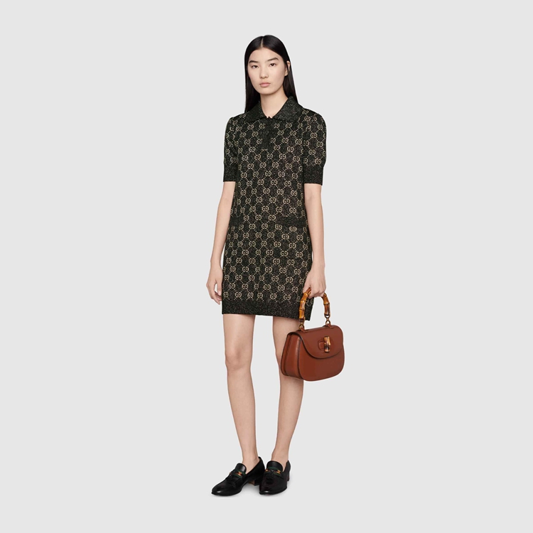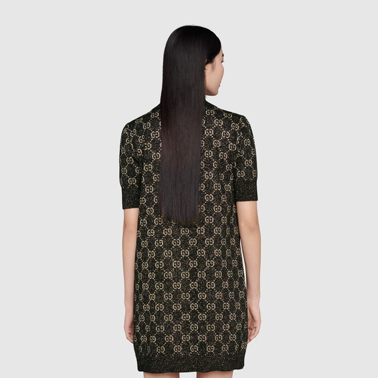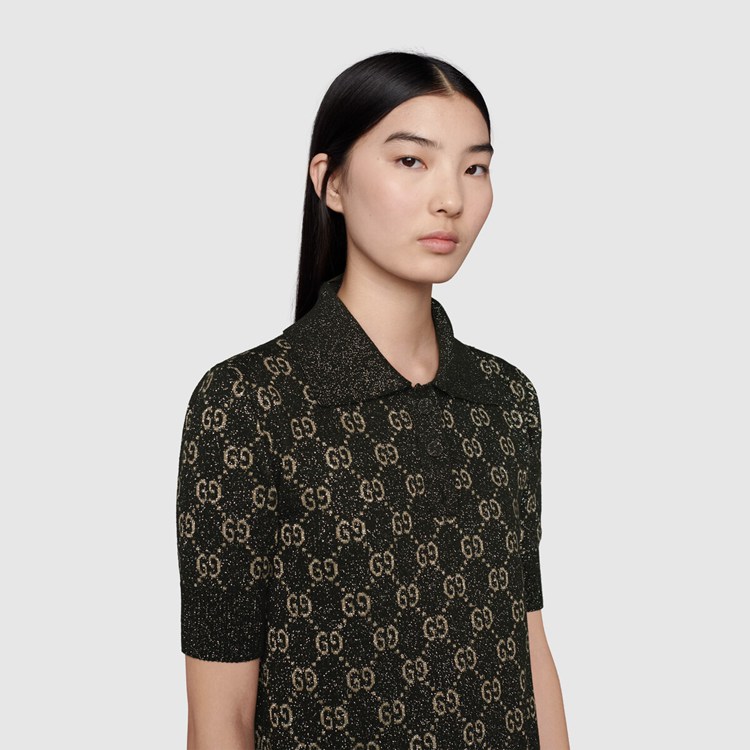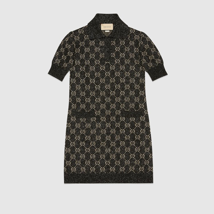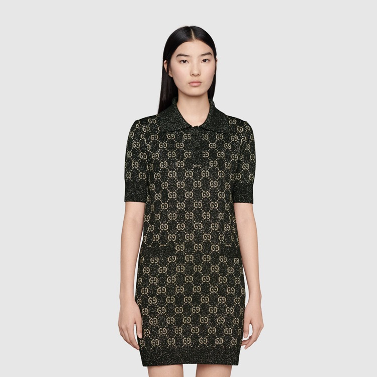 Style 678437 XKB54 1284 A strong logo feel is woven throughout The collection in an exploration of The possibility Within versatility. A range of ready-to-wear pieces from The Gucci Aria collection embodies This theme through a quintessentially Gucci motif reworked in contemporary ways. Here, The polo dress features a lamé GG jacquard motif.