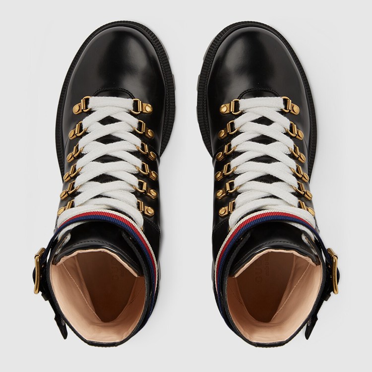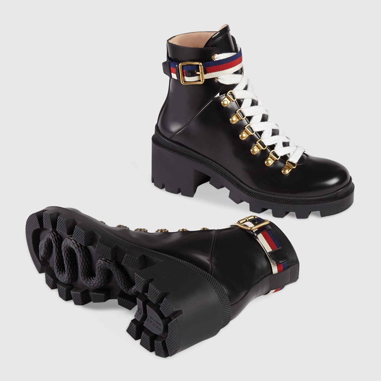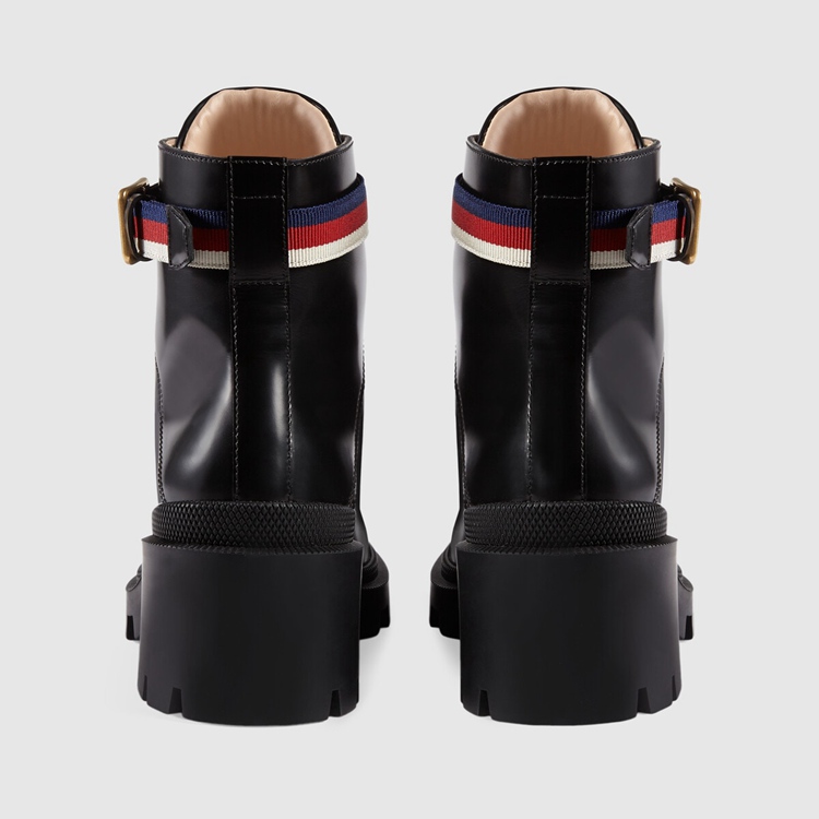 Style 481156 DKS30 1159 A lug soled leather boot is finished With a buckled strap around The ankle in Sylvie Web colours. The blue, red and white stripe first appeared on The Sylvie bag and has quickly become a House icon.