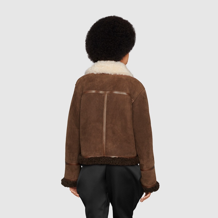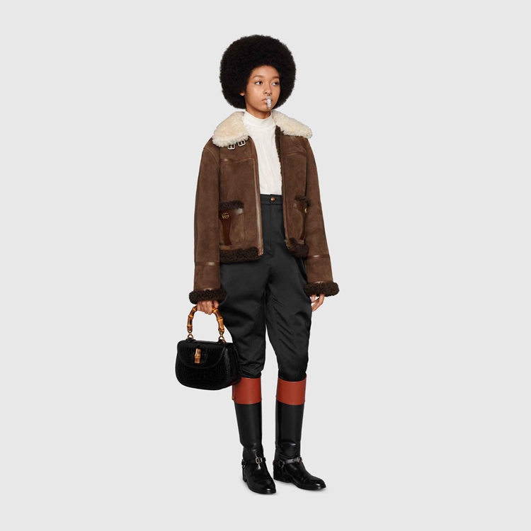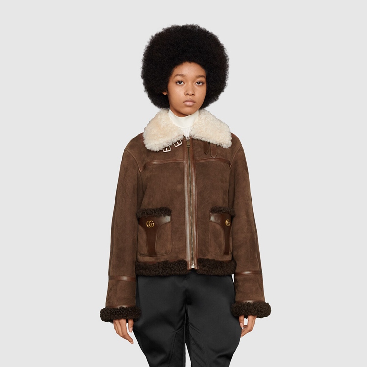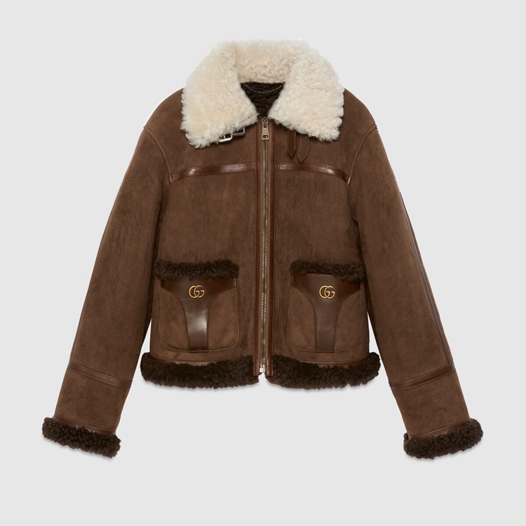Style 672067 XSACO 2351 Inspired by garments found in past decades of fashion, This leather jacket is lined With warm shearling. Designed For The colder weather, This style is further defined by Double G details at The pockets, a symbol that recalls The Emblematic GG Marmont hardware.