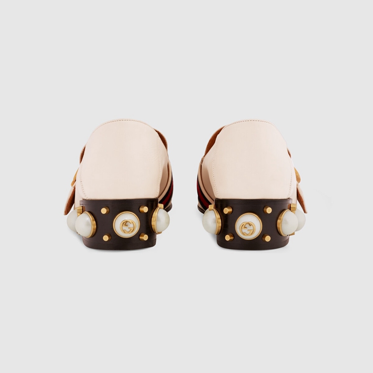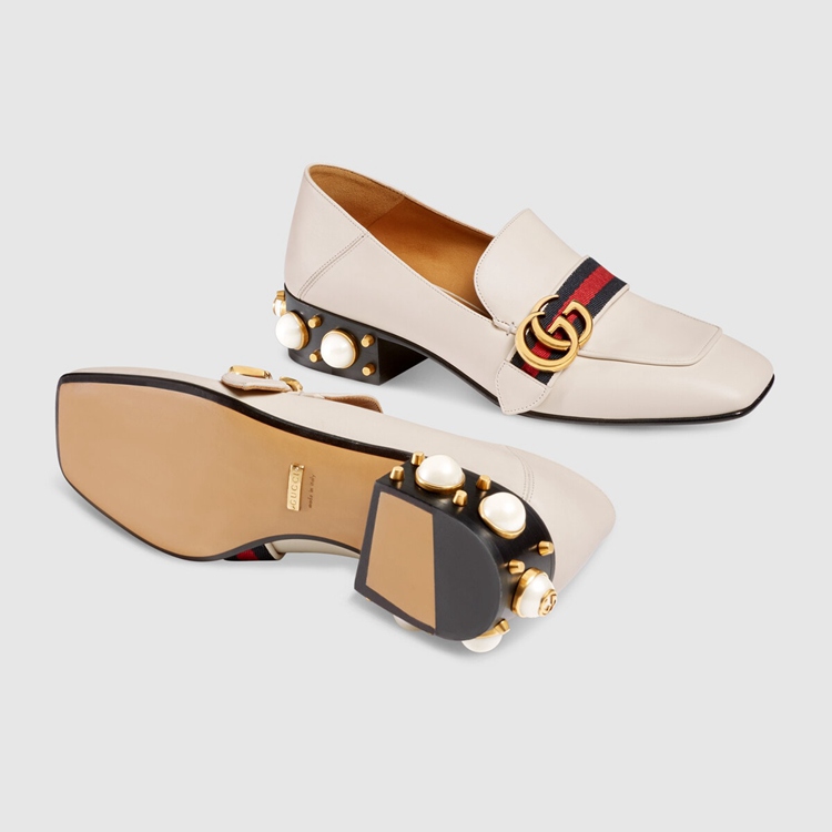 Style 423559 DKHC0 9061 The Double G antique gold-toned hardware is set on a blue and red Web of These leather mid-heel loafers. The stacked heel has a row of GG pearls and studs and The back is designed to be worn With The heel folded down or up.
