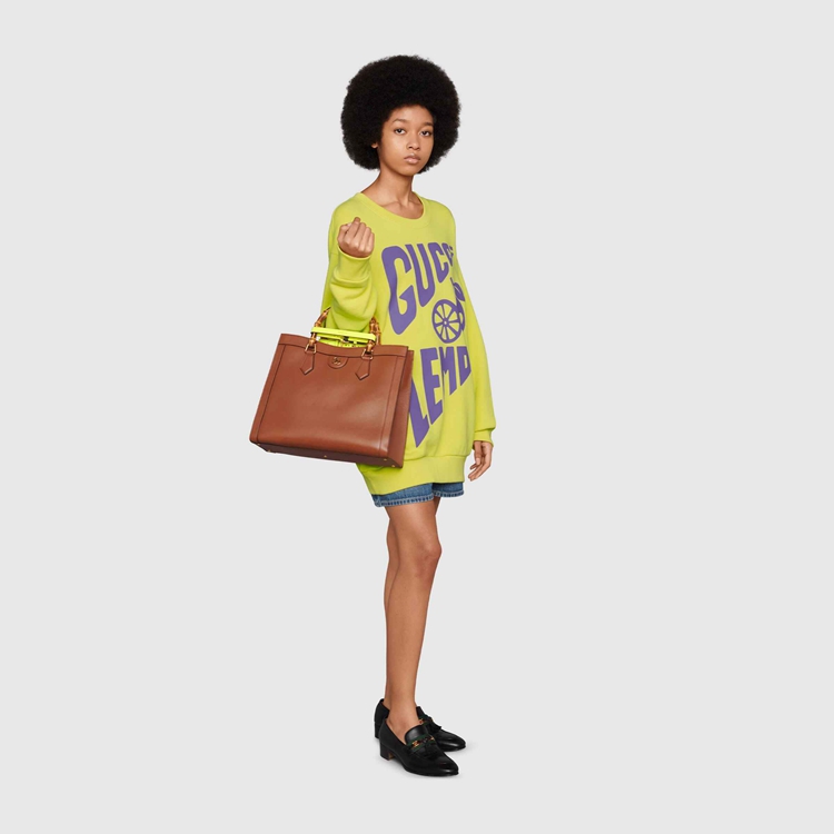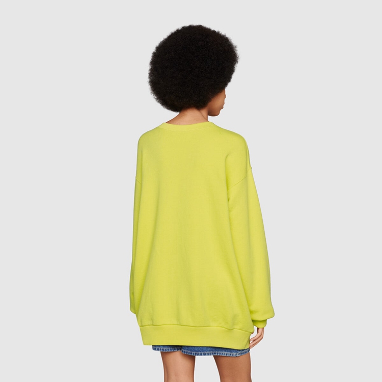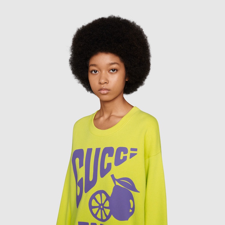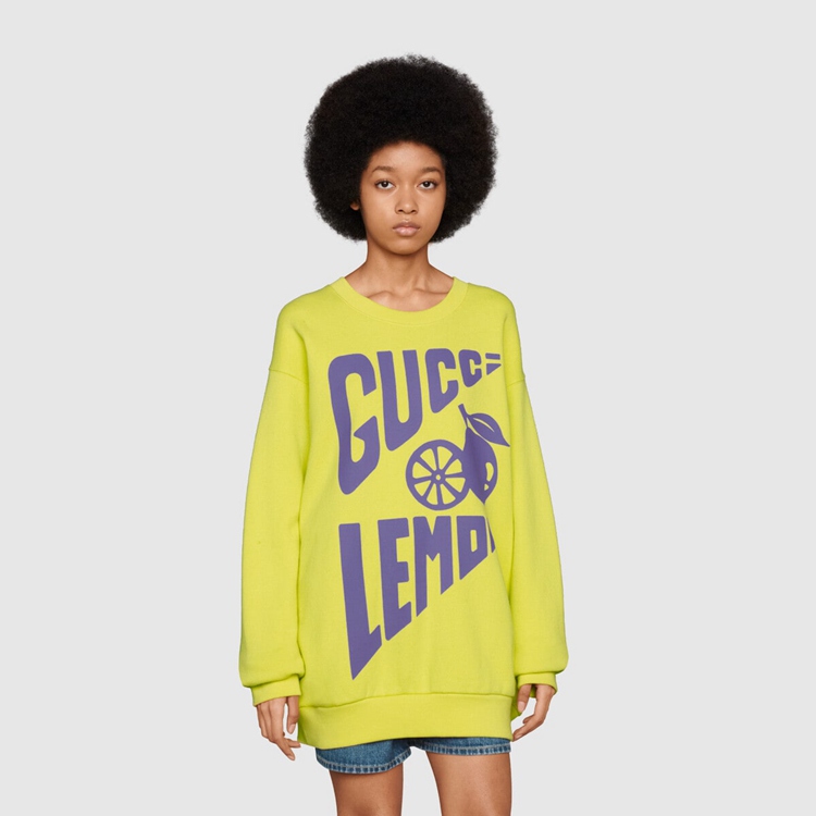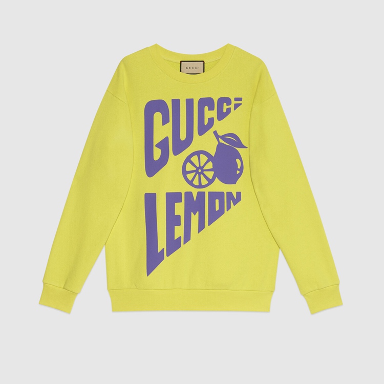 Style 617964 XJDZC 7253 Part of The Gucci references to pop culture, fruits in all shapes and forms continues to enrich The House’s narrative. For Aria, they appear as playful prints, often enriching a selection of ready-to-wear pieces. This bright yellow cotton sweatshirt is animated by a ‘Lemon Gucci’ print.