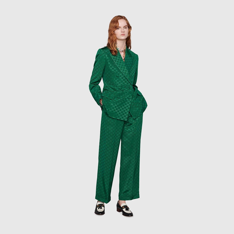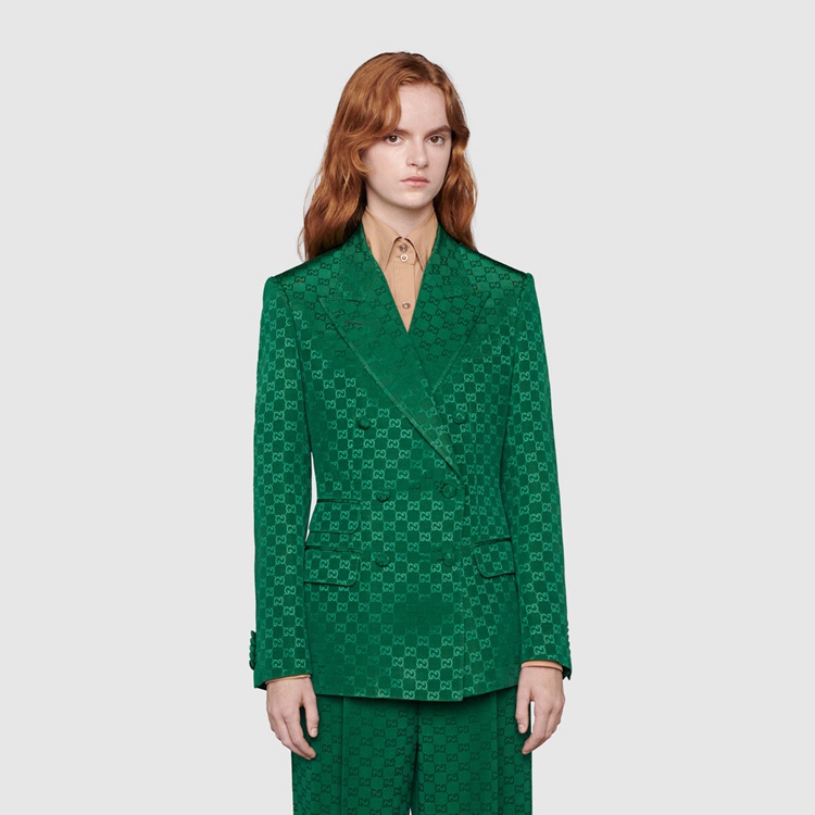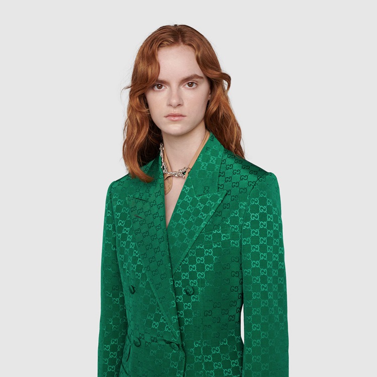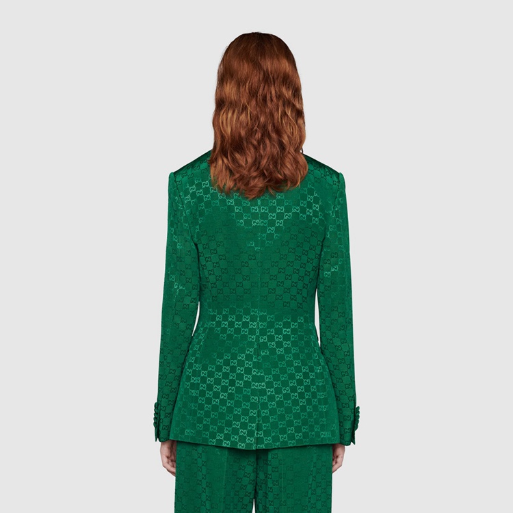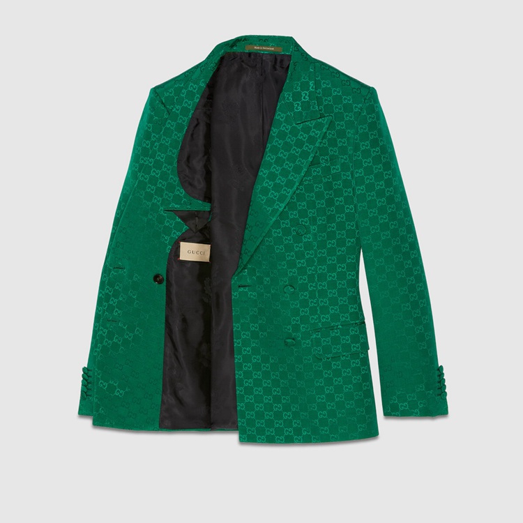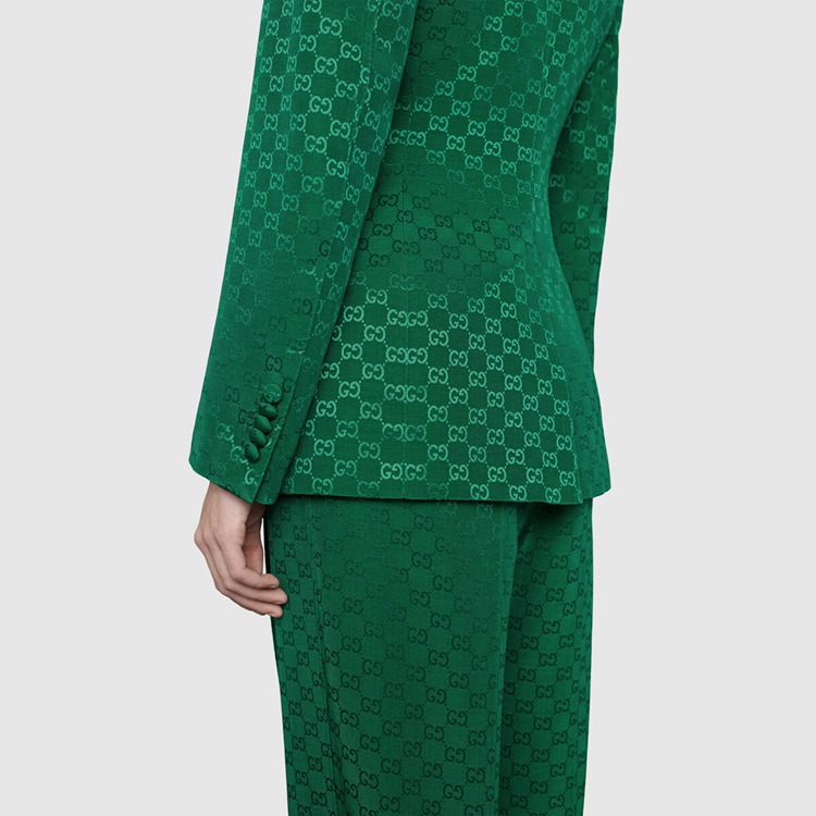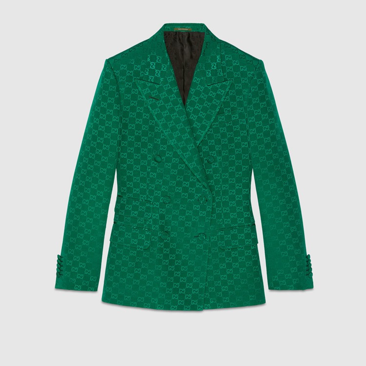 Style 669527 ZAHMD 3493 Crafted from emerald green light GG canvas, This jacket is Part of an assortment of tailored pieces that combine sartorial details and an eclectic vision. The Emblematic GG motif, a reference to Guccio Gucci’s initials, defines This piece.