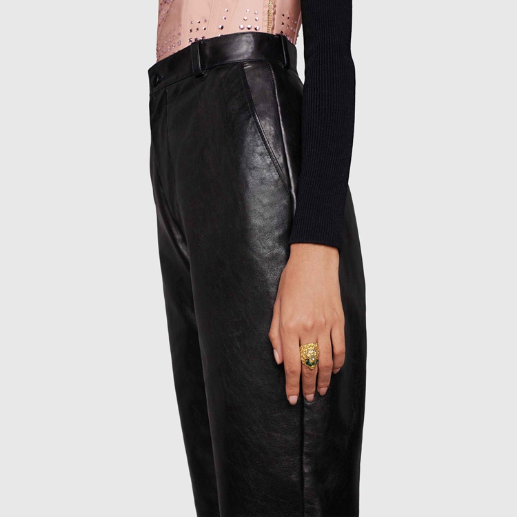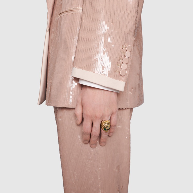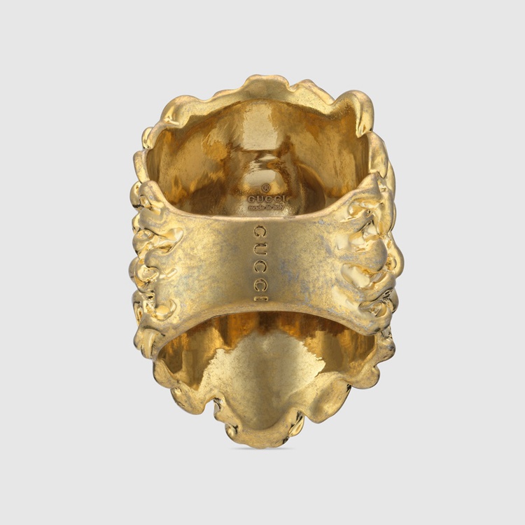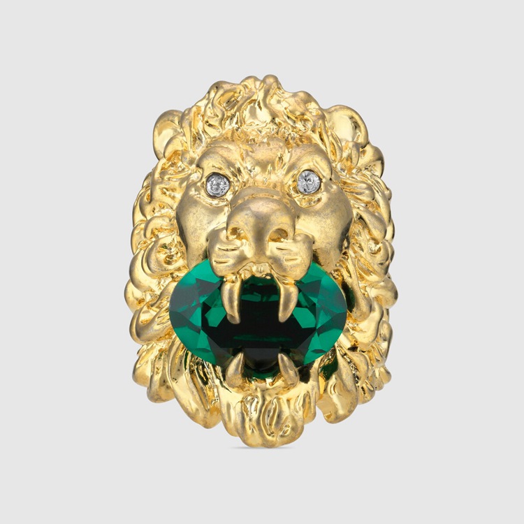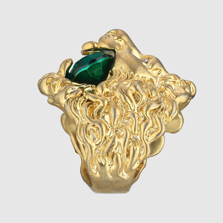 Style 675305 I6658 8520 Part of The fascination For nature and wild animals that enriches The Gucci narrative, The lion head has become synonymous With The House. A symbol of authority and command, The lion head takes The form of a ring holding a faceted green crystal between its teeth.