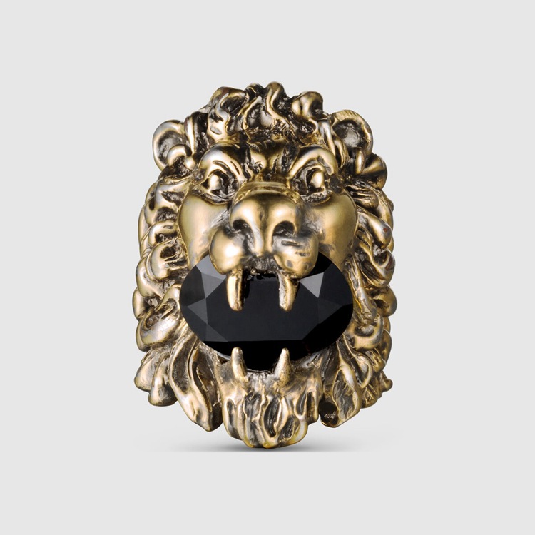 Style 402763 J1D50 8029Made in metal With aged gold finish, our lion head ring holds a black faceted crystal in its mouth.
