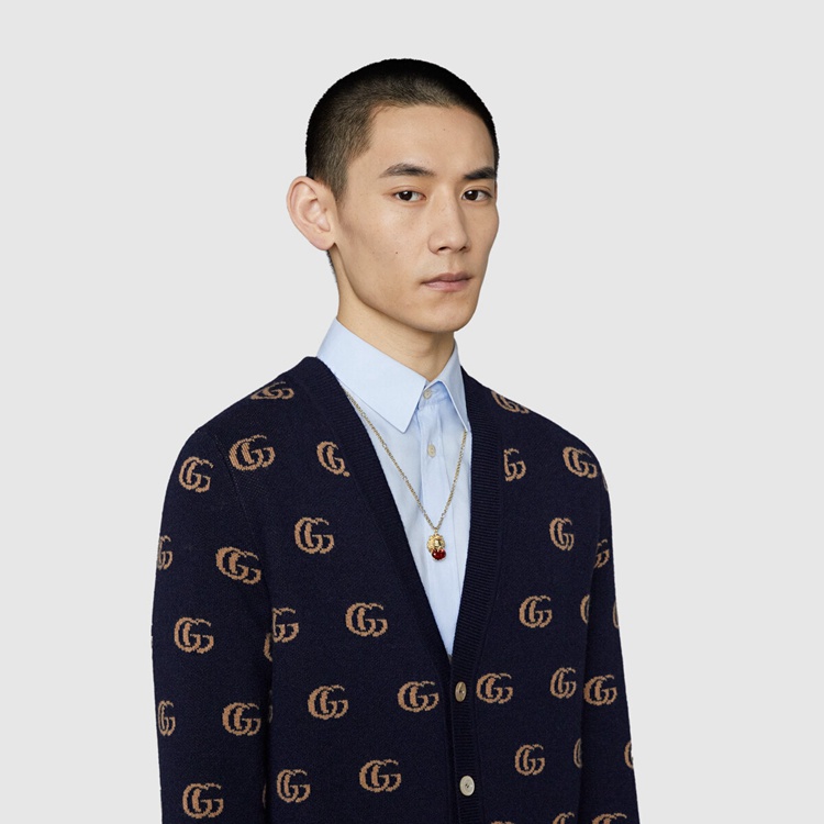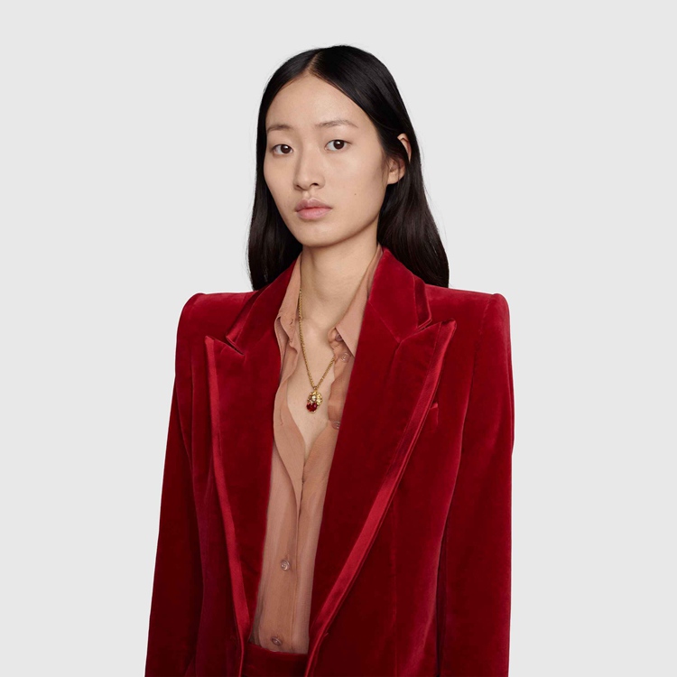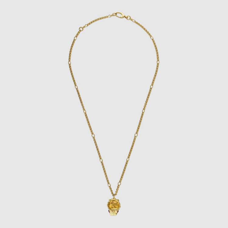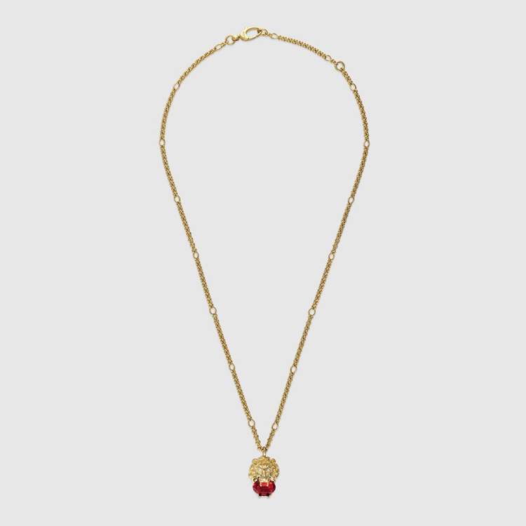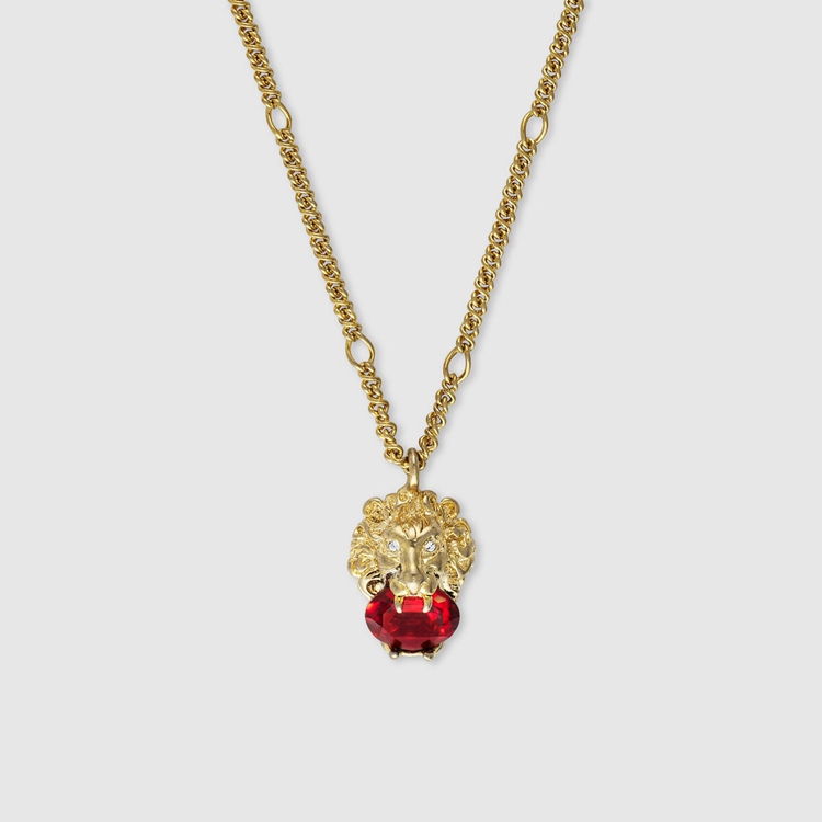 Style 677366 I6658 8489 Part of The fascination For nature and wild animals that enriches The Gucci narrative, The lion head has become synonymous With The House. A symbol of authority and command, here it appears as a pendant on This necklace holding a faceted red crystal in its mouth.