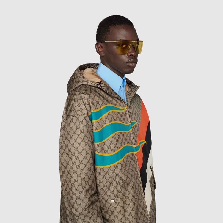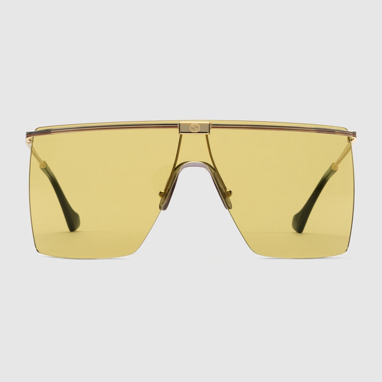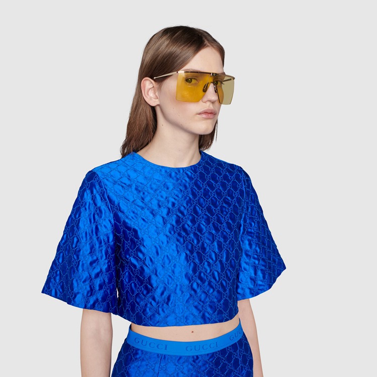 Style 691352 I3330 8170 This bold and futuristic mask design is characterized by The House Web and signature Interlocking G detail. The two emblems nod to Gucci’s heritage, enriching This modern sunglasses frame With archival elements.