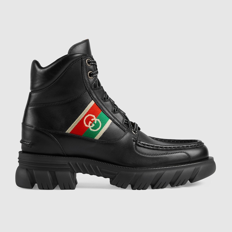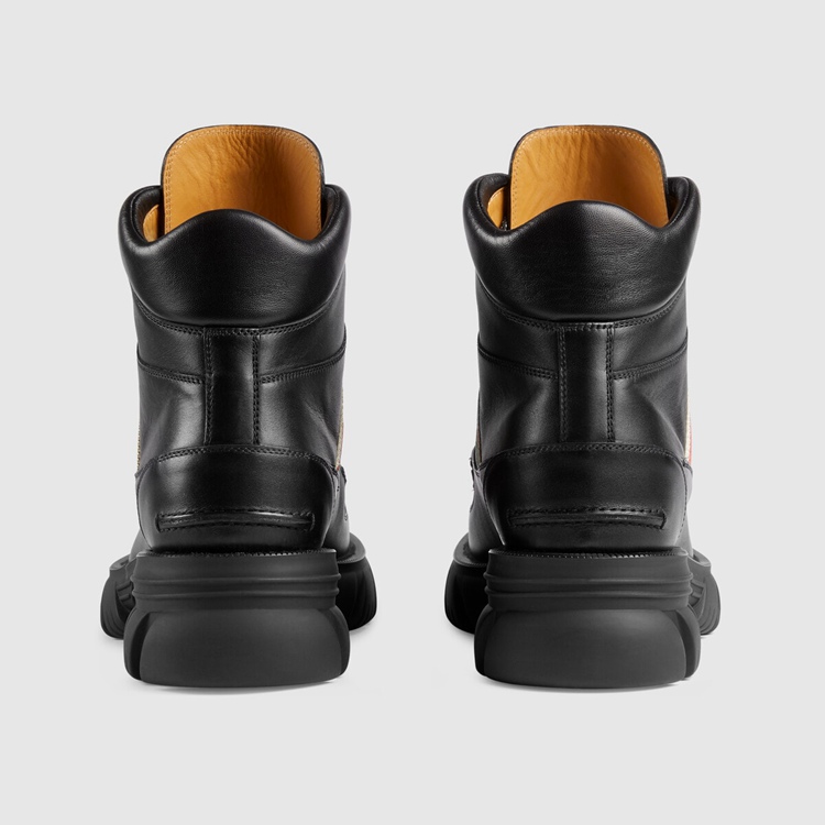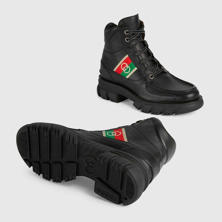 Style 663368 DTNE0 1080 The House continues to look to The world of sports and leisure as a source of inspiration. Crafted from black leather, This pair of ankle boots references These influences With its lug sole and lace-up closure. The mood is further enhanced by a monogram stripe detail—reminiscent of logo tapes found on vintage tracksuits.
