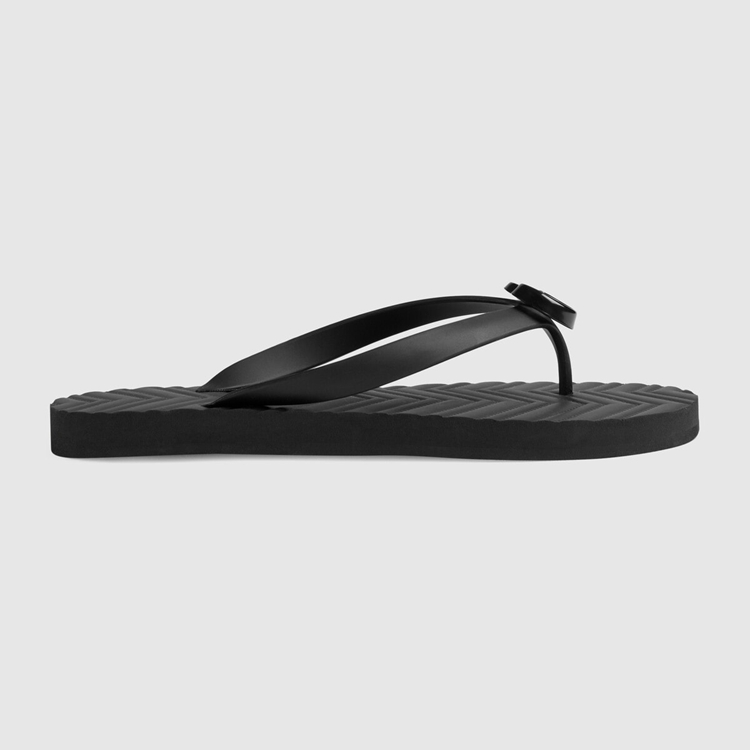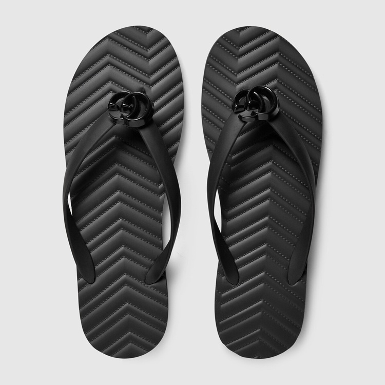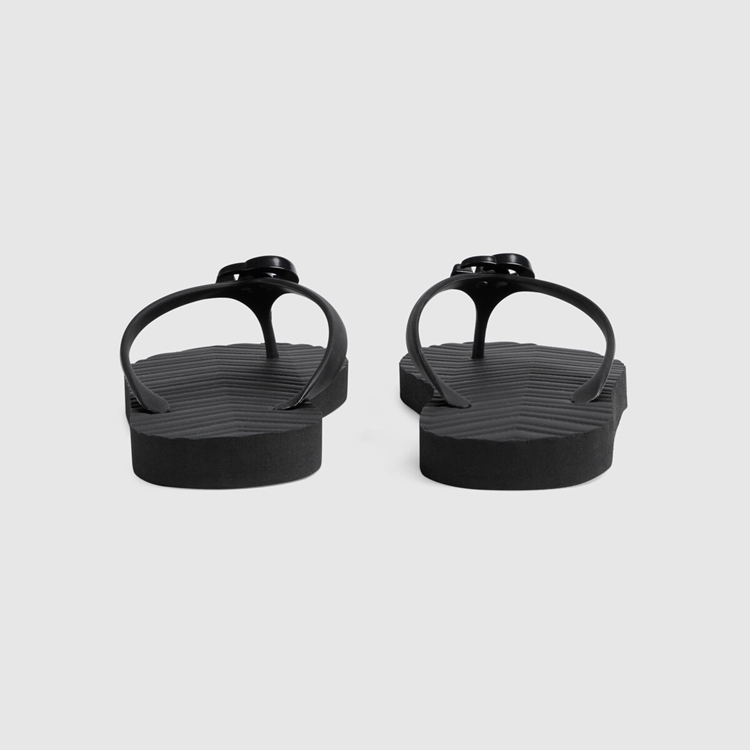 Style 659229 J8710 1000Textured patterns have become a mainstay of Gucci’s most Emblematic designs. Here, The recognizable motif is presented in black rubber. The thong sandal is completed by The House’s Double G hardware in tonal resin.