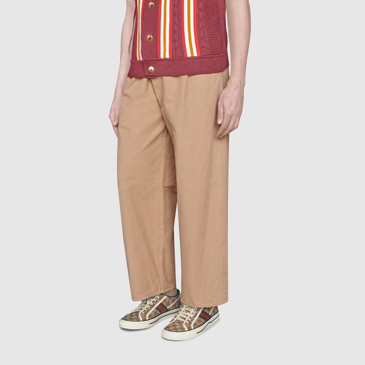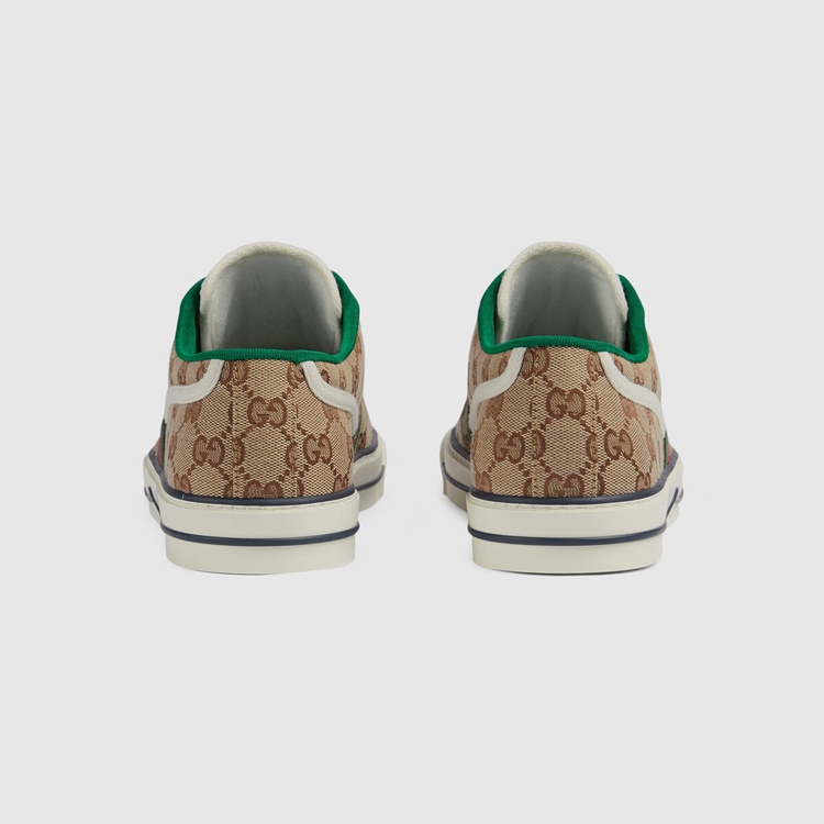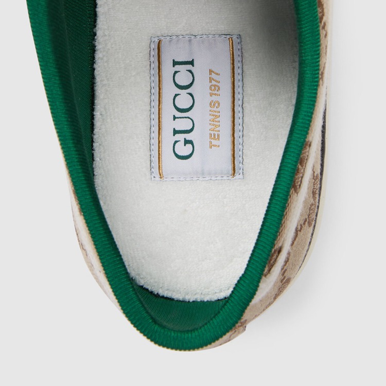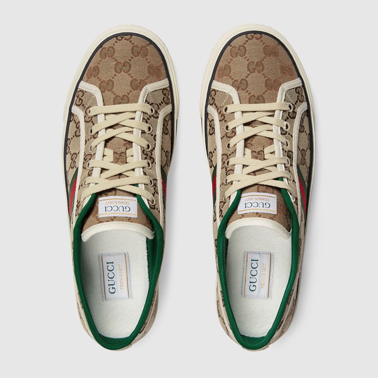 Style 606111 HVK20 9766 The low-top sneaker is presented in original GG canvas in its Classic Color combination of beige and ebony. The style combines different elements from The House’s heritage such as The Gucci Tennis 1977 label, a textured GG motif at The sole and The Web—details which recall The House’s connection to The world of sports and leisure.