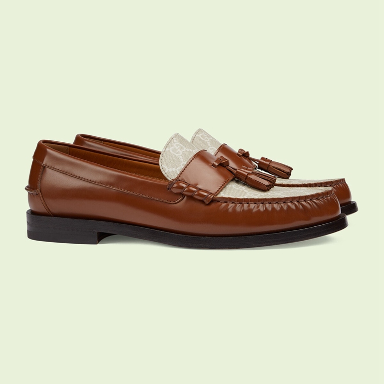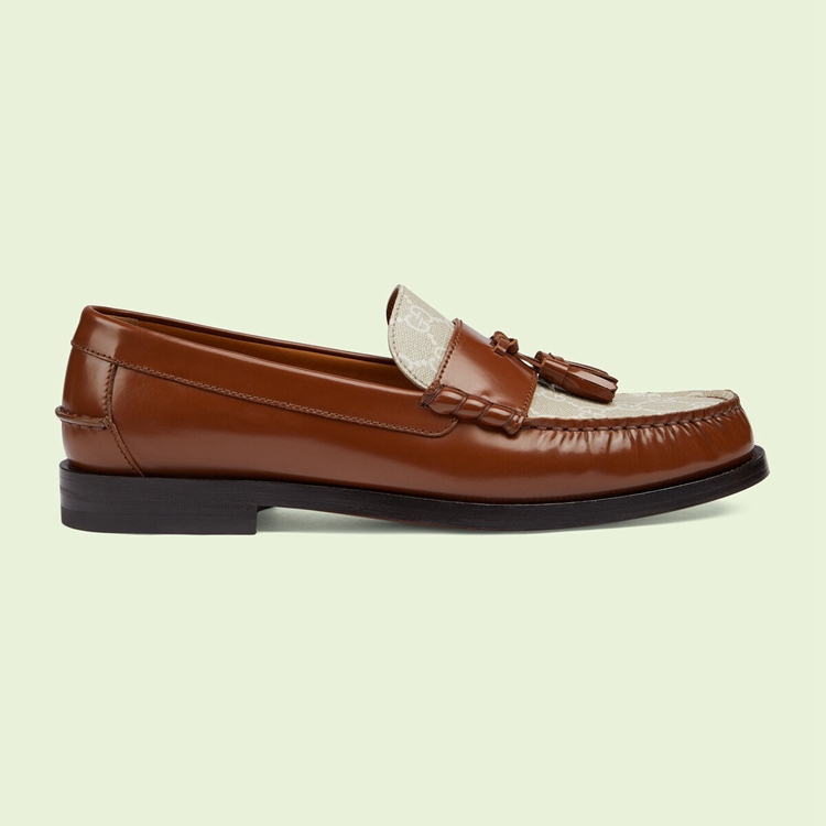 Style 673817 17X50 2580An evolution of The House’s Emblematic loafer, This pair of shoes is presented in a mix of cuir-colored leather and GG Supreme canvas. The elegant style takes on a versatile feel through a whimsical tassel detail.
