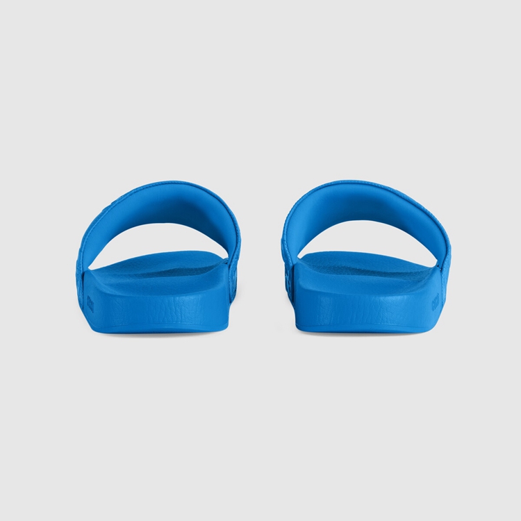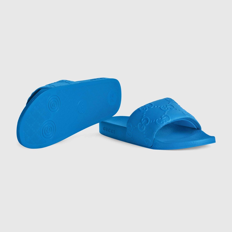 Style 681880 UKU00 4344 This pair of slide sandals is Crafted from bright blue Demetra With an allover GG motif. Created With The same processes used For tanning, The New material offers pliable and resilient performance With a supple finish. The eco-friendly material combines animal-free raw materials primarily from sustainable, renewable, and bio-based sources.