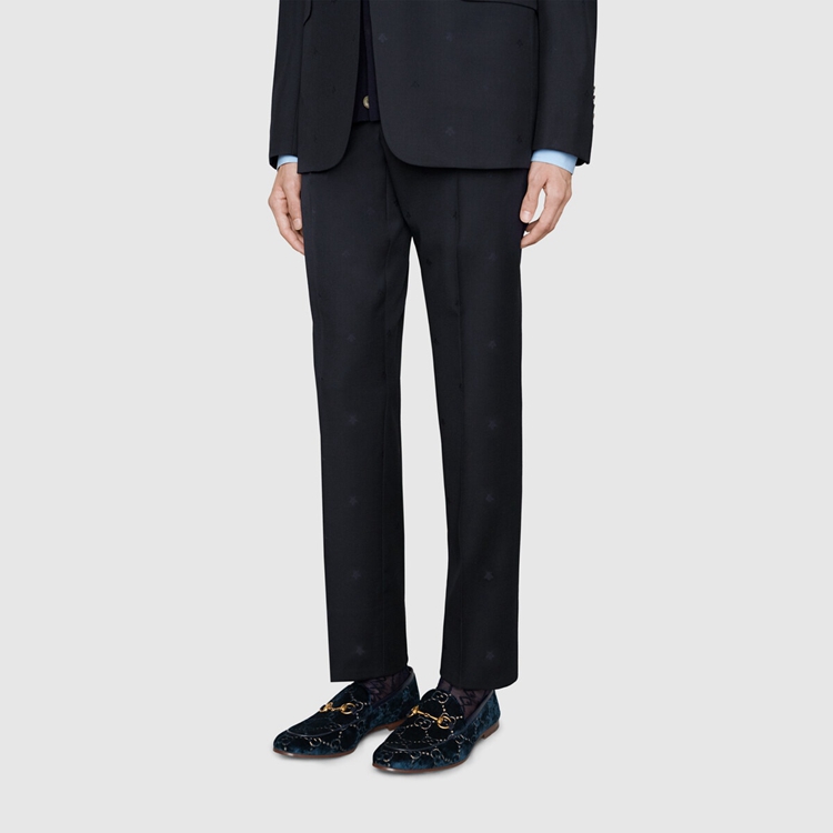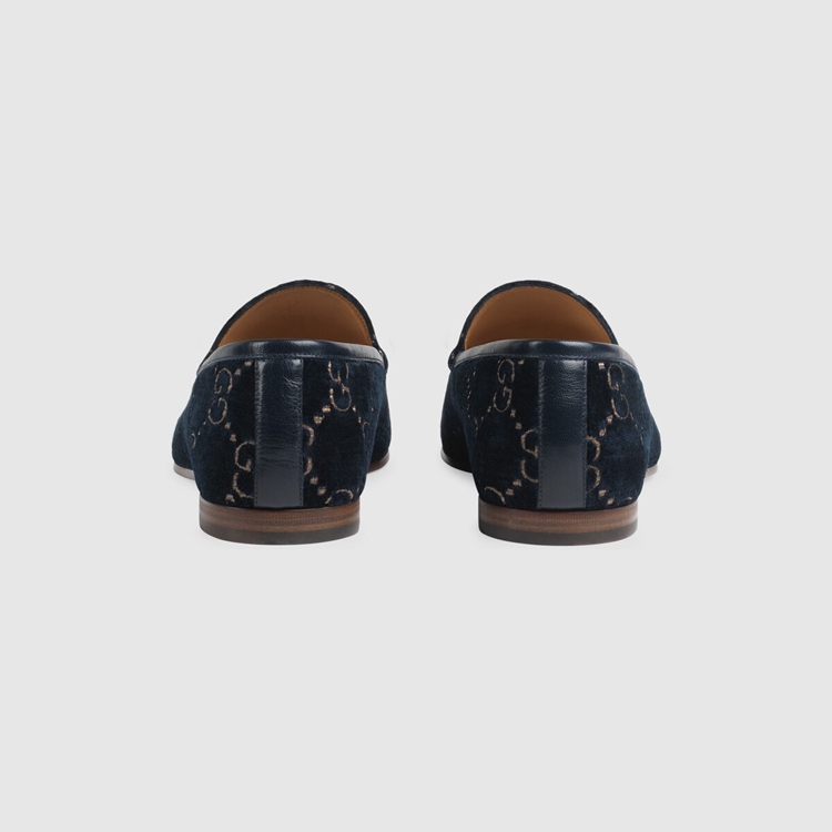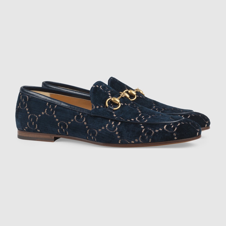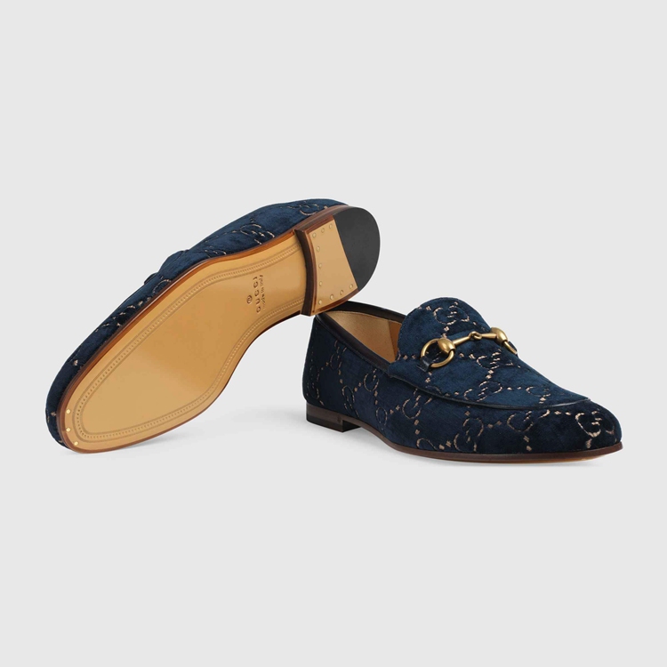 Style 430088 9TI90 4286Designed With an elongated toe and streamlined silhouette, The Gucci Jordaan embodies The refined craftsmanship of The loafer combined With distinct House codes. Since The introduction of its Classic shape in The 1950s, The preppy- Inspired shoe has continued its influence, redesigned in New forms and materials. Made in GG velvet—a distinctive fabric taken from The archives— The shoe is outlined With blue leather and topped With The Horsebit.