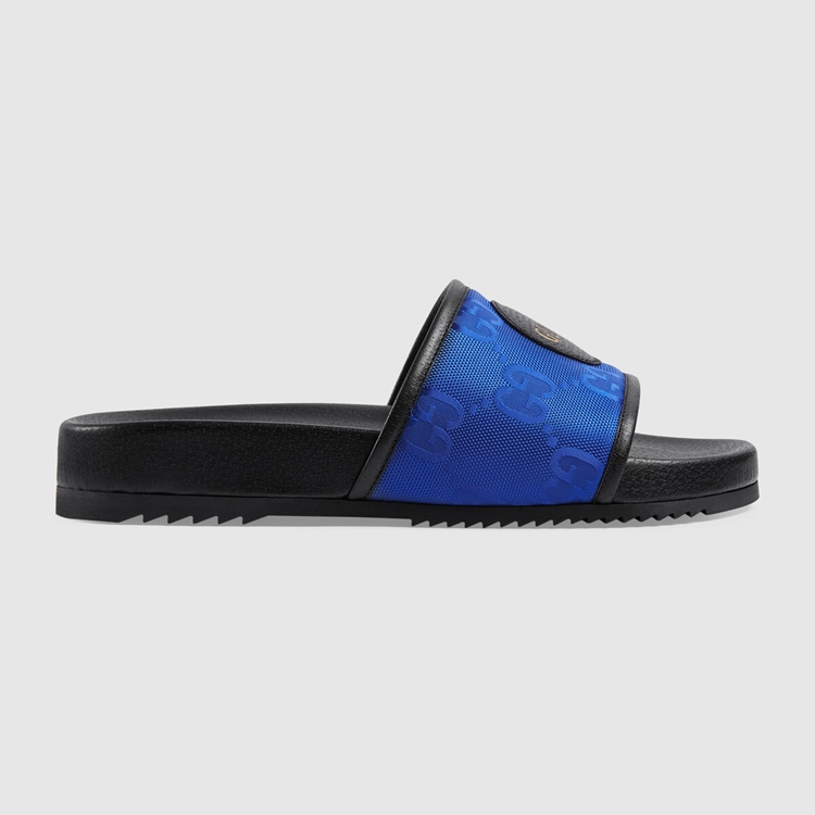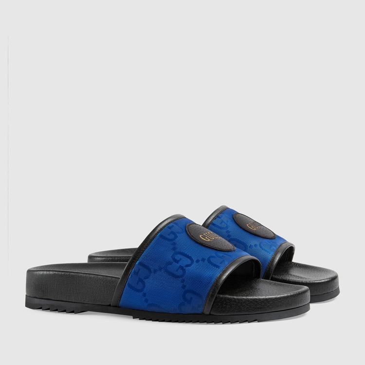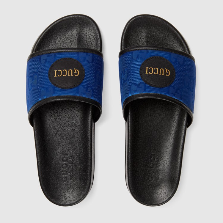 Style 644754 H9H90 4260 The slide sandal is introduced Within a line of accessories and ready-to-wear made from recycled materials and trims, supporting The House’s commitment to sustainability. Gucci Off The Grid is The first collection from Gucci Circular Lines—a concept created to support The House’s vision For circular production. Designed For those mindful of their environmental impact, Gucci Off The Grid uses recycled, organic, bio-based and sustainably sourced materials. Regenerated nylon, Crafted using recycled sewing thread and trims displays The GG pattern against an opaque background in black.