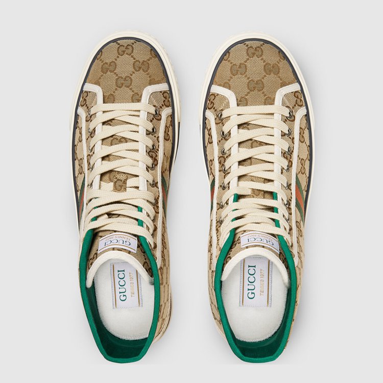 Style 625807 HVK70 9765 The Gucci Tennis 1977 sneaker is presented in a high-top version For The Pre-Fall 2020 collection. The sneaker is Crafted from a monogram canvas that combines With The textured GG motif at The sole and The House Web. The style is finished With a dedicated label With The name of The line and a subtle embroidered detail of The number 77.