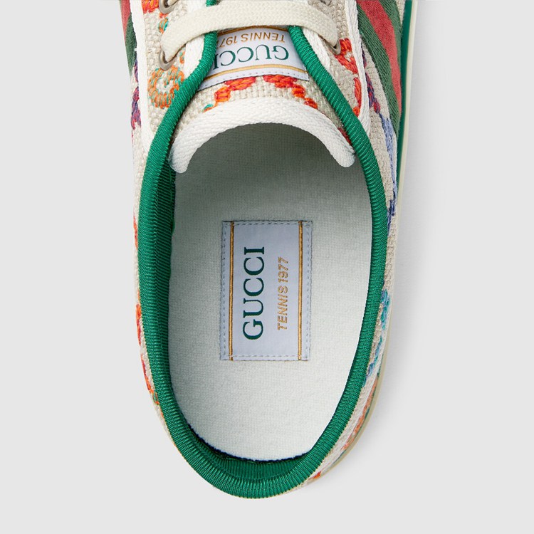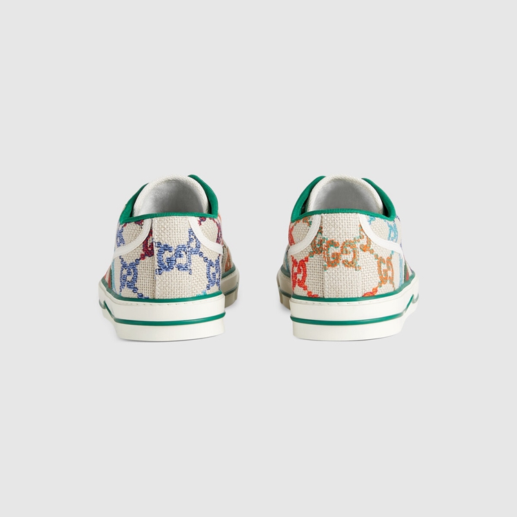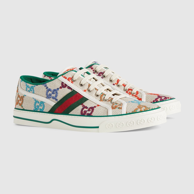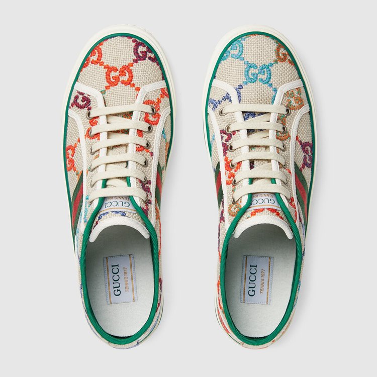 Style 606111 UFT30 8466First used in The 1970s, The GG logo was an evolution of The original Gucci rhombi design from The 1930s, and from then it’s been an established symbol of The House’s heritage. Here, The pattern defines This pair of Gucci Tennis 1977 sneakers in vibrant colors. Deepening The connection to The brands’ heritage, Guccio Gucci’s initials also appear as a raised motif at The sole.