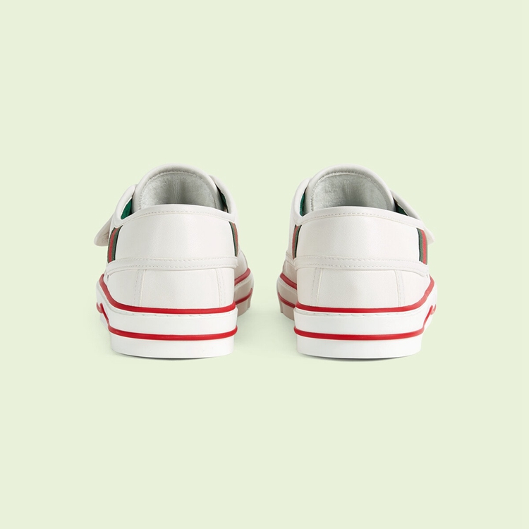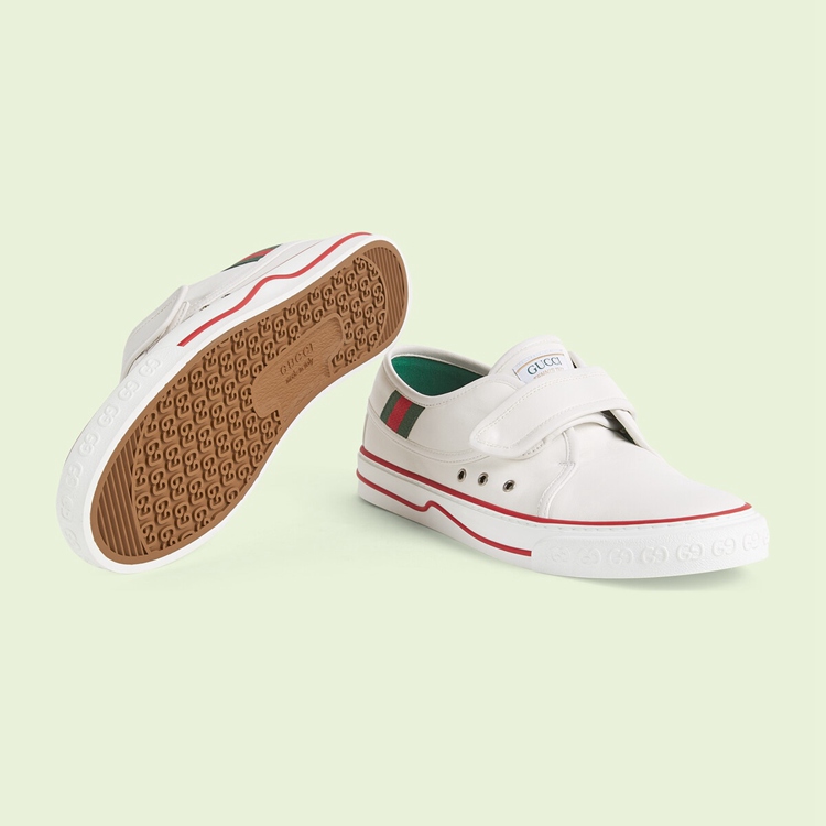Style 694744 17L10 9060 The bowling shoe reinvented. This sneaker’s defined Velcro strap is reminiscent of The Retro bowling allies from decades past. Taken from The archives, The pair is presented in white leather and defined by The House Web in green and red.