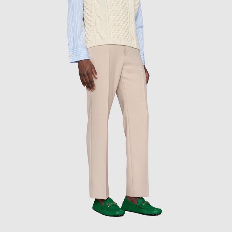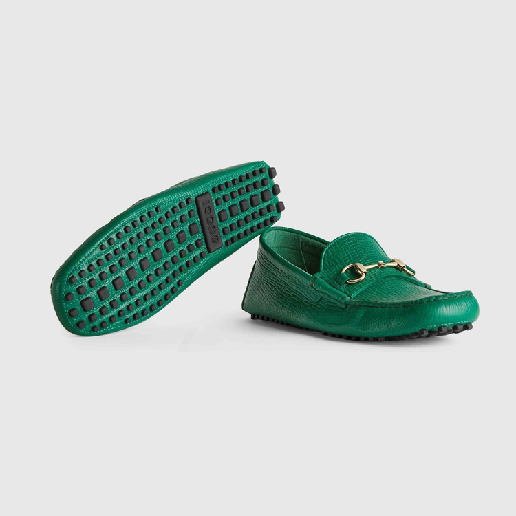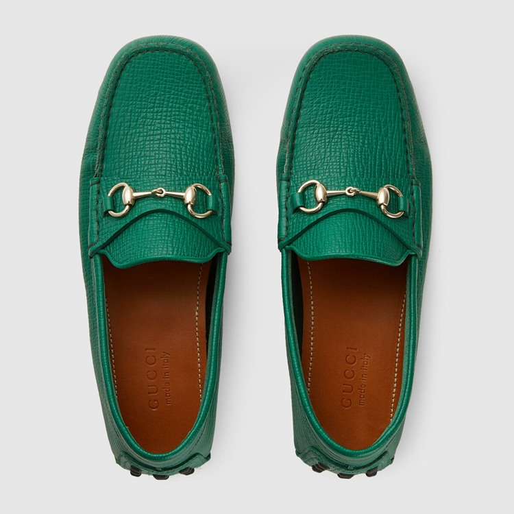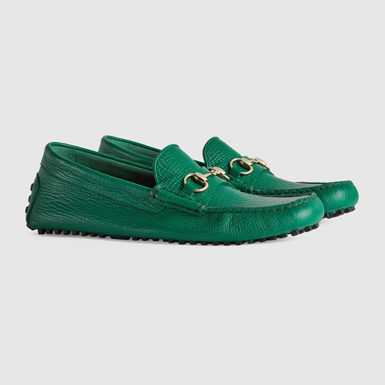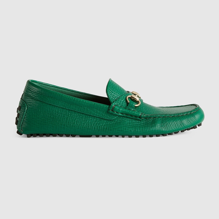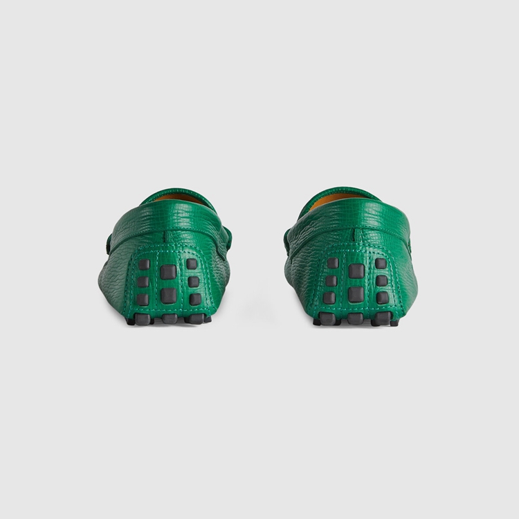 Style 674254 UDU00 3120 A green leather driver distinguished by palladium-toned Horsebit hardware. The driving shoe was first introduced as a contemporary evolution of The traditional loafer silhouette, distinguished by a pebbled sole For extra grip. Since then, The shoe has become a Classic design and is reimagined through The Gucci lens each season.