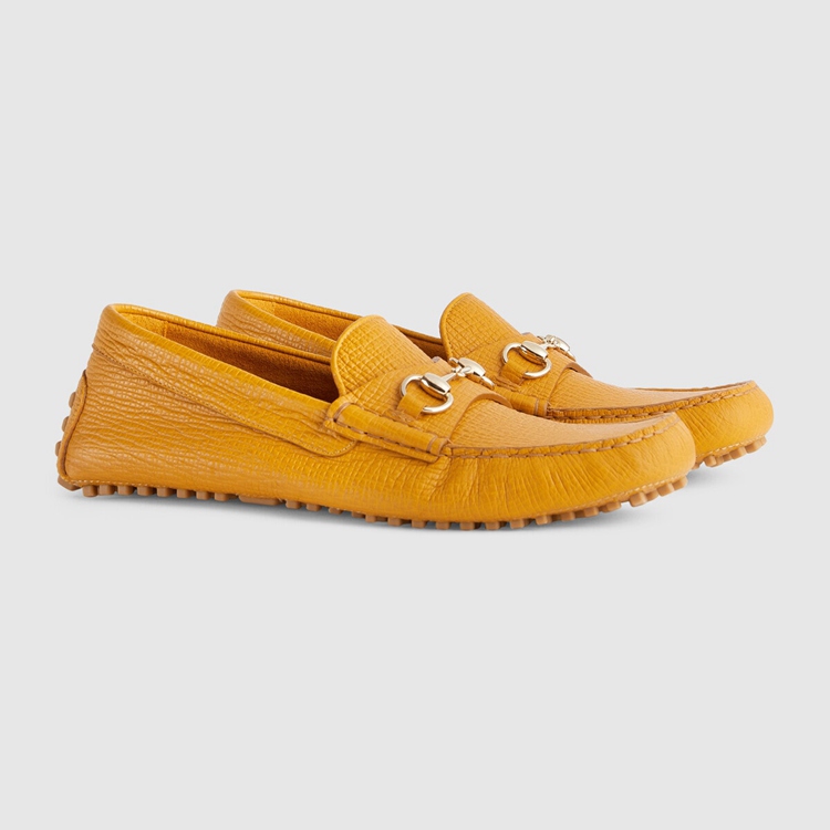 Style 674254 UDU00 7744 A orange leather driver distinguished by palladium-toned Horsebit hardware. The driving shoe was first introduced as a contemporary evolution of The traditional loafer silhouette, distinguished by a pebbled sole For extra grip. Since then, The shoe has become a Classic design and is reimagined through The Gucci lens each season.