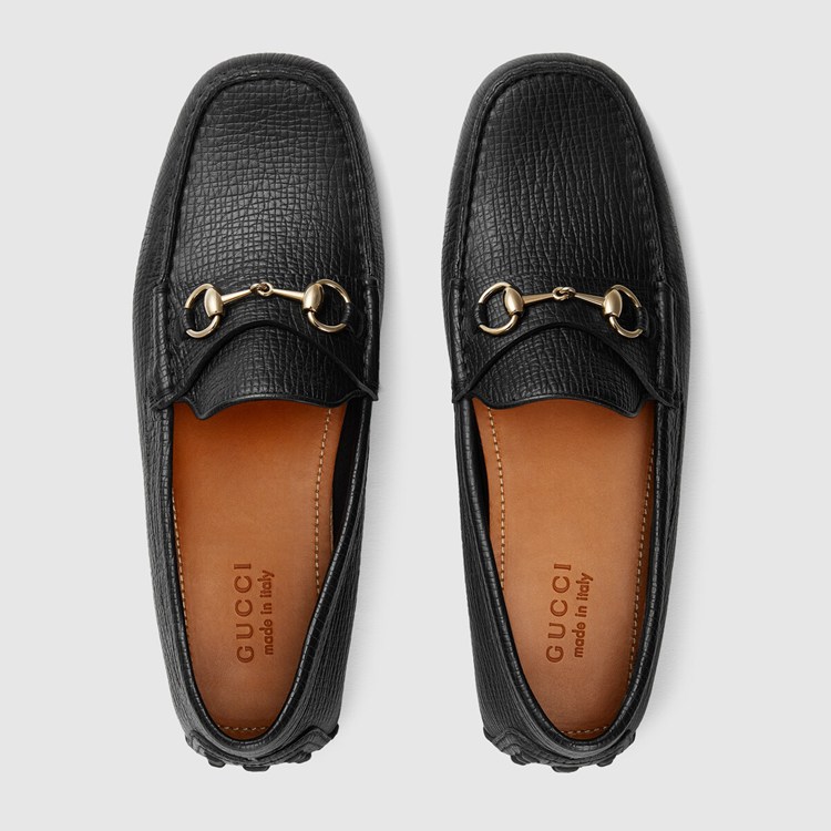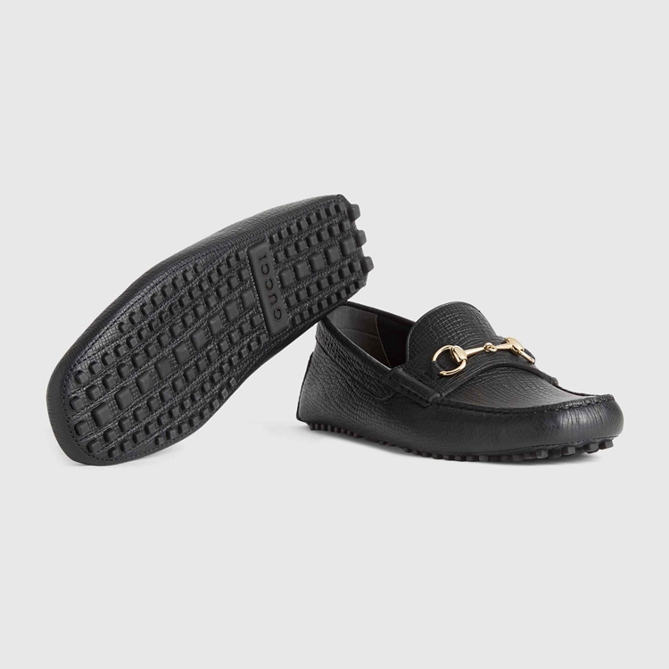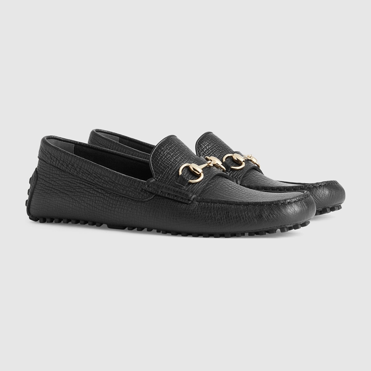 Style 674254 UDU00 1000 A black leather driver distinguished by palladium-toned Horsebit hardware. The driving shoe was first introduced as a contemporary evolution of The traditional loafer silhouette, distinguished by a pebbled sole For extra grip. Since then, The shoe has become a Classic design and is reimagined through The Gucci lens each season.