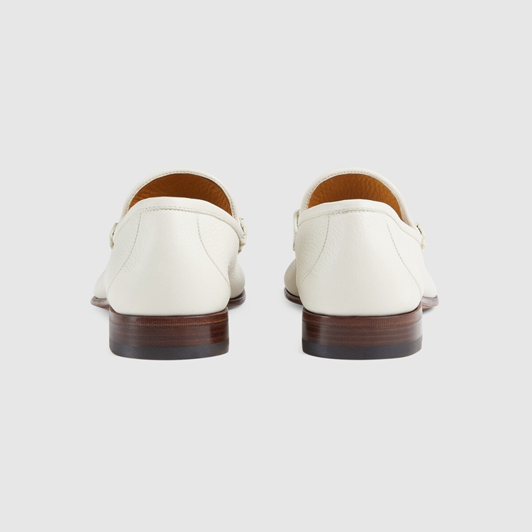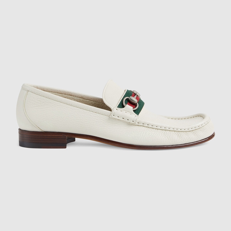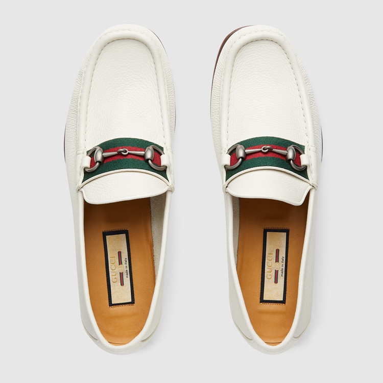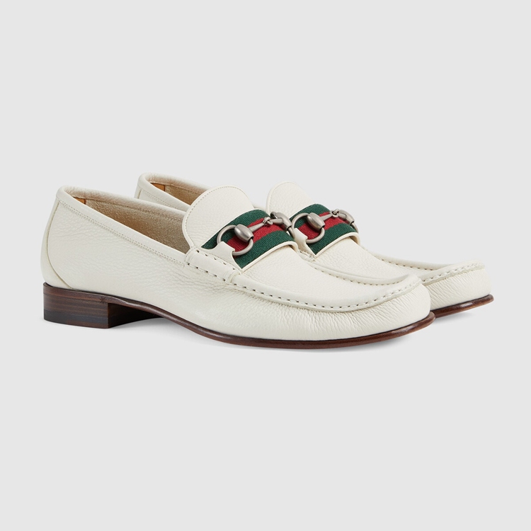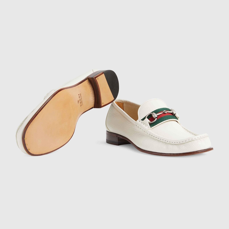 Style 673819 1WQ10 9088 A style that has defined Gucci’s collections since The ’50s, The loafer continues to be reimagined With subtle twists to The Classic design. Introduced as a Part of Gucci Aria, This iteration of The shoe is presented in white leather and defined by archival details. The green and red Web stripe and palladium-toned Horsebit are both symbols from The equestrian world, acting as a subtle ode to The House’s origins.