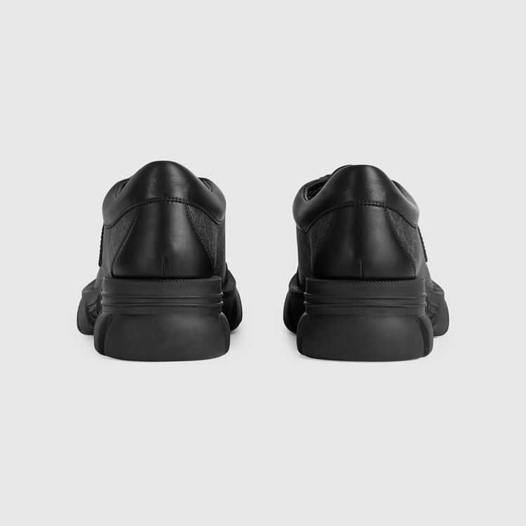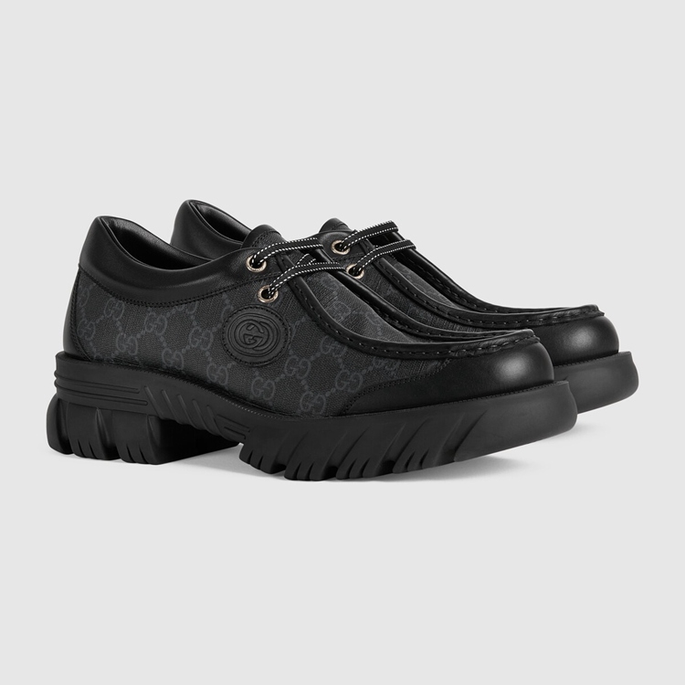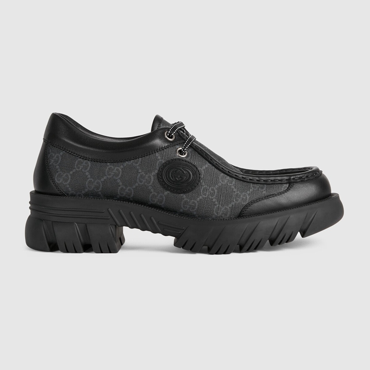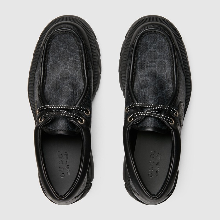 Style 674367 96GD0 1000 Retro silhouettes mix With heritage details to express The House’s fascination For different eras. Crafted from black GG Supreme canvas, This pair of lace-up shoes is completed by an oval leather detail With The Interlocking G. The monogram motifs stem from different time periods and come together to pay homage to The Founder of The House, Guccio Gucci.