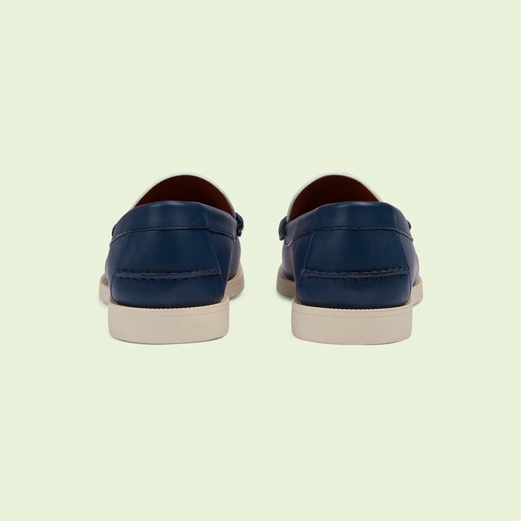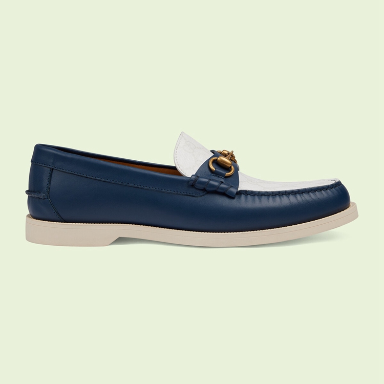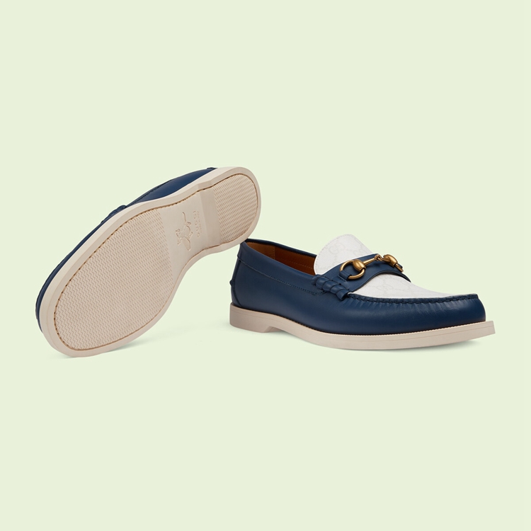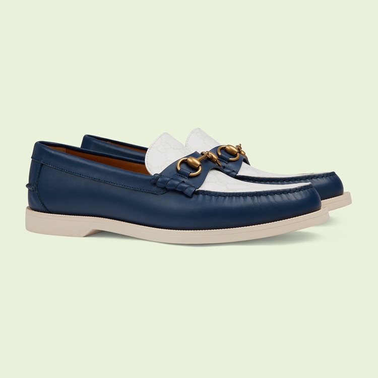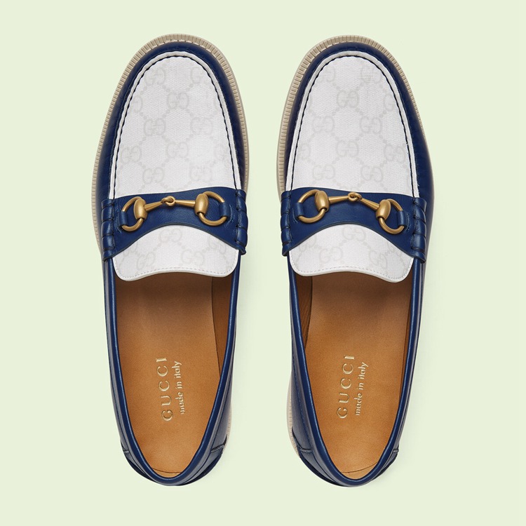 Style 695049 UPG50 4890Appearing in a ’50s collection, The Horsebit loafer has become a symbol of The House. Here, The Emblematic design is presented in a mix of blue leather and white GG Supreme detail.