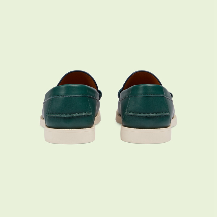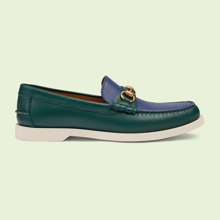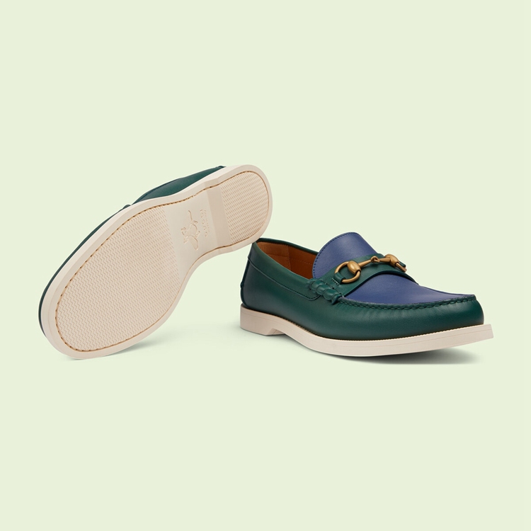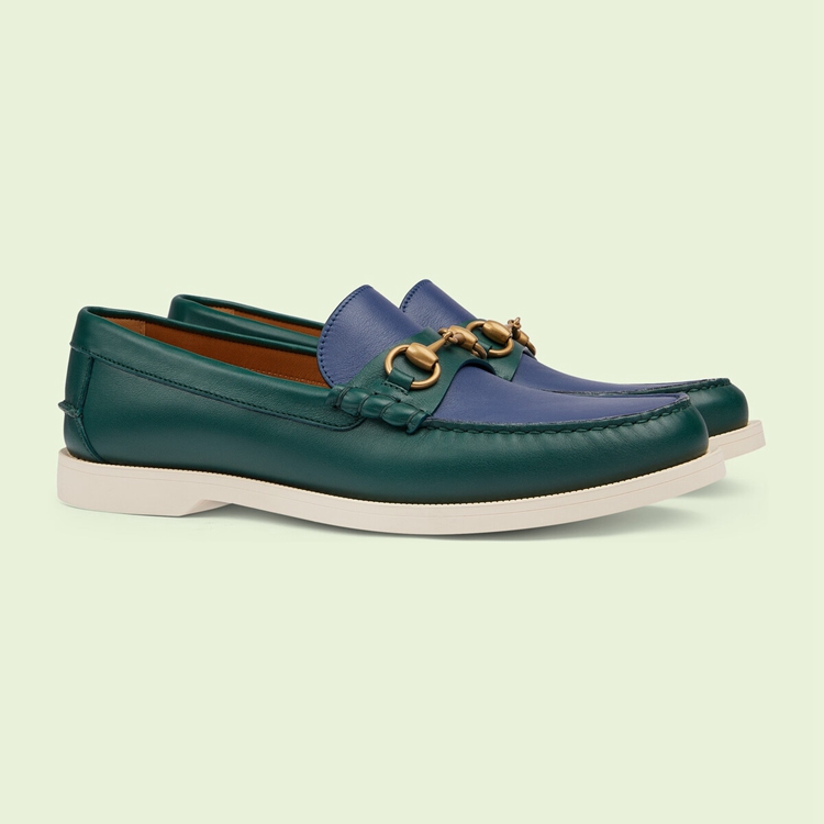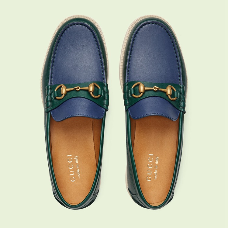 Style 695049 UPG70 3160First appearing in The ’50s, The Horsebit loafer has become an Emblematic style that defines each era of The House’s heritage. A Part of Gucci Love Parade’s journey through The archives, The style is presented in a mix of blue and green leather. The square-toe shape is a subtle reference to vintage iterations of The shoe.