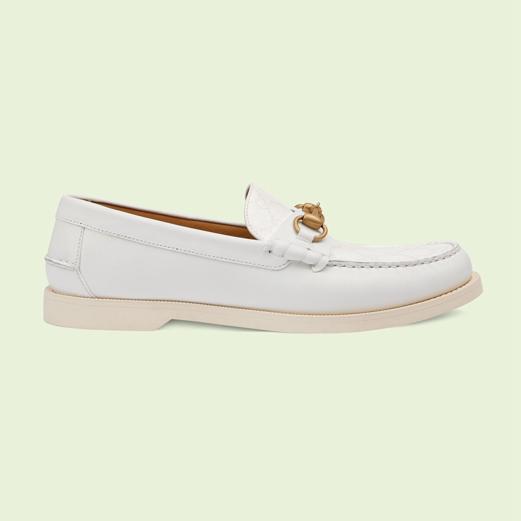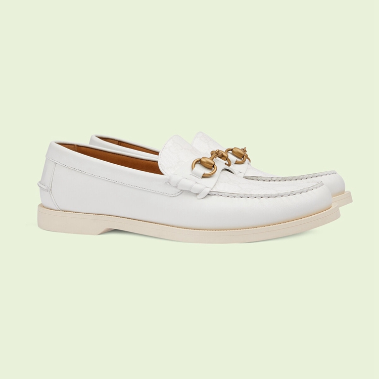 Style 695049 UPG50 9000First appearing in The ’50s, The Horsebit loafer has become an Emblematic style that defines each era of The House’s heritage. A Part of Gucci Love Parade’s journey through The archives, The style is presented in a mix of white leather and GG Supreme canvas The square-toe shape is a subtle reference to vintage iterations of The shoe.