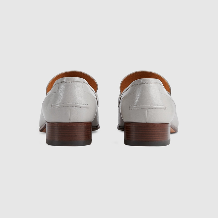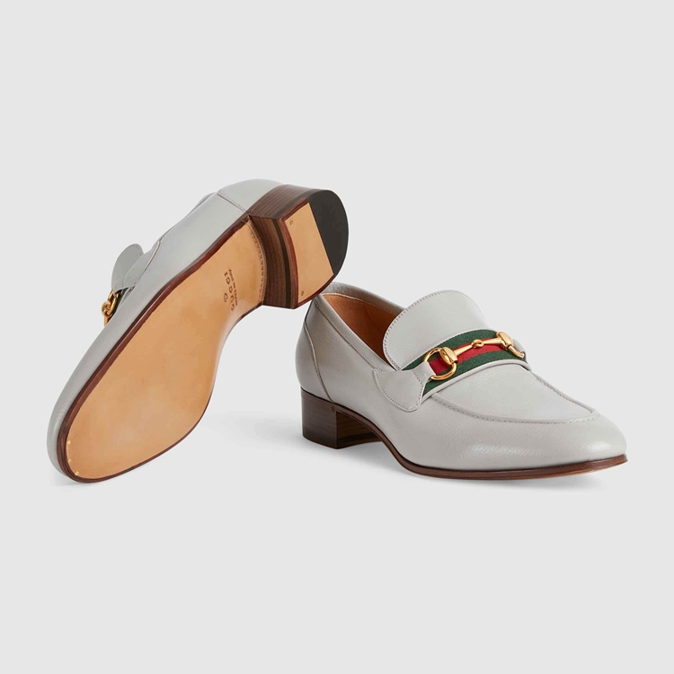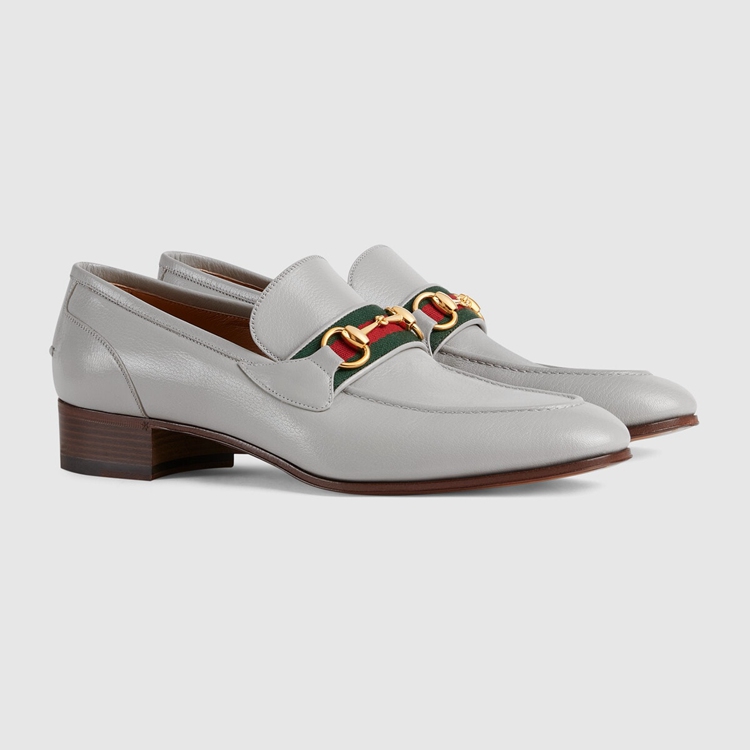 Style 655579 0G0P0 1460 Instantly recognizable emblems of The brand, logos enrich Designs in New and unexpected ways. Behind every logo lies The tradition and value of The House, an everlasting medium One can wear again and again. References to The House’s equestrian heritage, The Horsebit and Web stripe combine This loafer. The leather shoe is presented in grey—emphasizing The style’s minimalist feel.