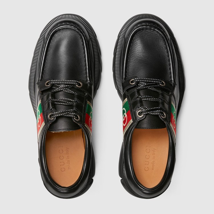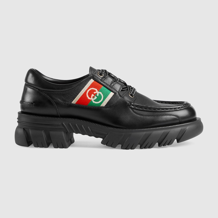 Style 663369 DTNE0 1080 The House continues to look to The world of sports and leisure as a source of inspiration. Crafted from black leather, This pair of shoes references These influences With its lug sole and lace-up closure. The mood is further enhanced by a monogram stripe detail—reminiscent of logo tapes found on vintage tracksuits.